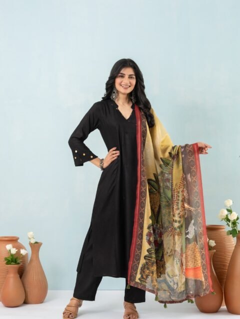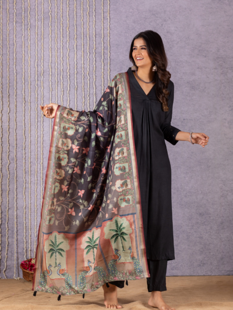 This gorgeous digitally printed dupatta Will be a perfect addition to your ethnic collection. The pichwai print adds to the beauty of this concept. Flowers gracing the border of the dupatta, like nature’s delicate touch. This dupatta is trendy yet a classic addition to your wardrobe.