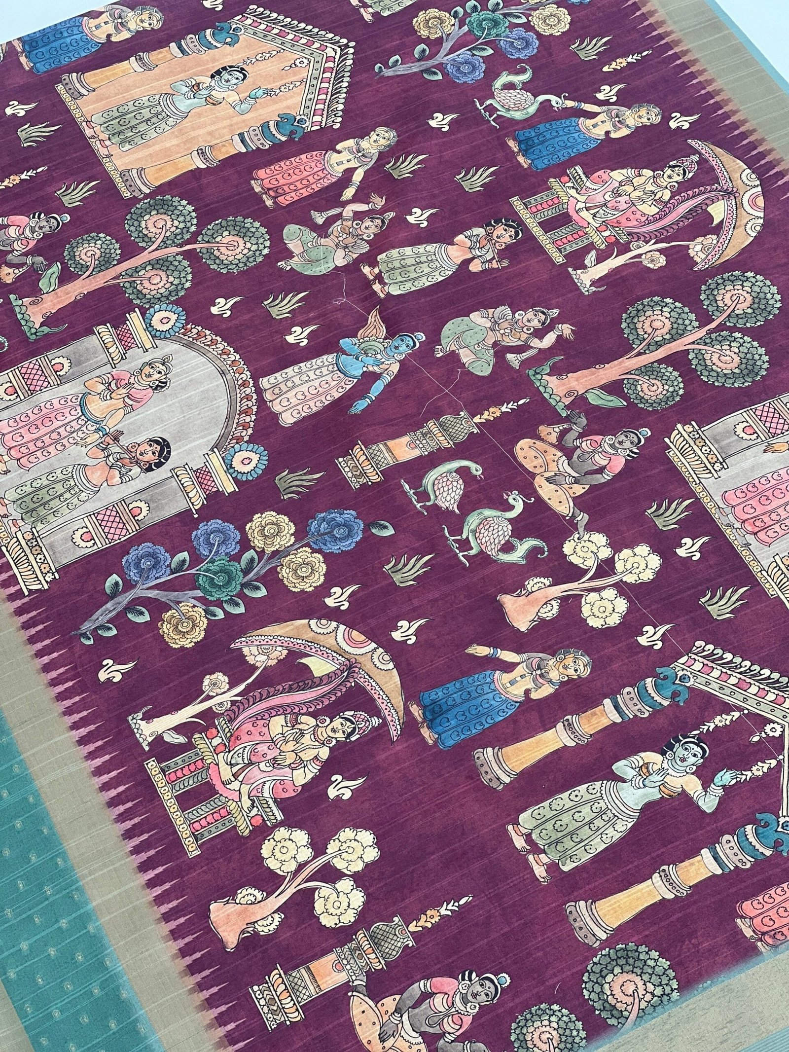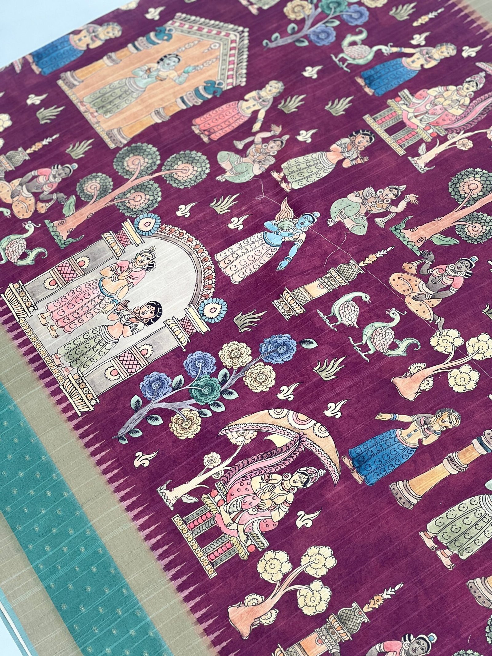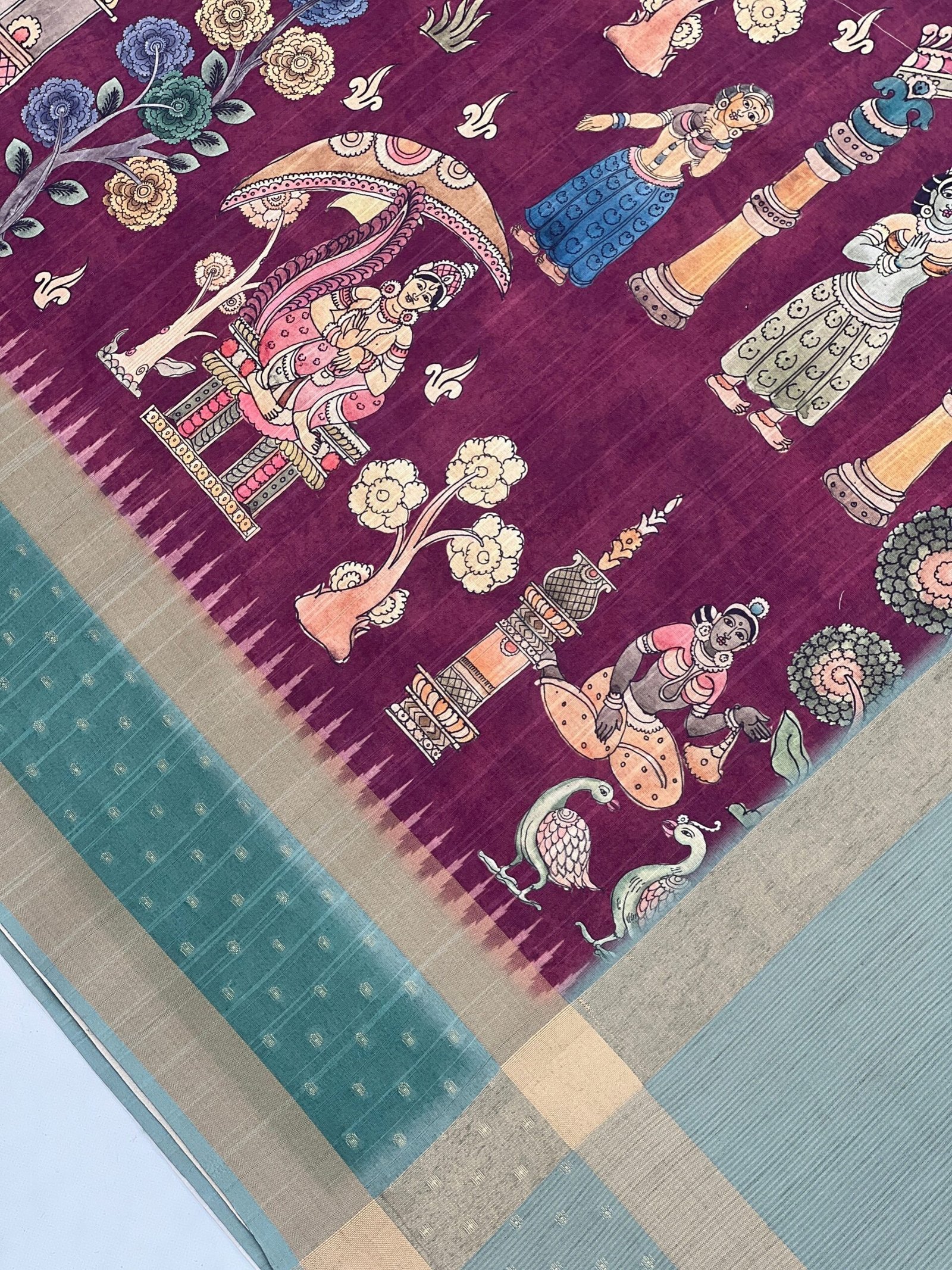 Indulge in the elegance of handloom tussar silk saree, where graceful figures of dancing ladies adorn the body, while a meticulously weaving pallu and border showcase intricate patterns. Enhanced with a delicate jacquard butti, this saree is a timeless masterpiece, embodying tradition and artistry.