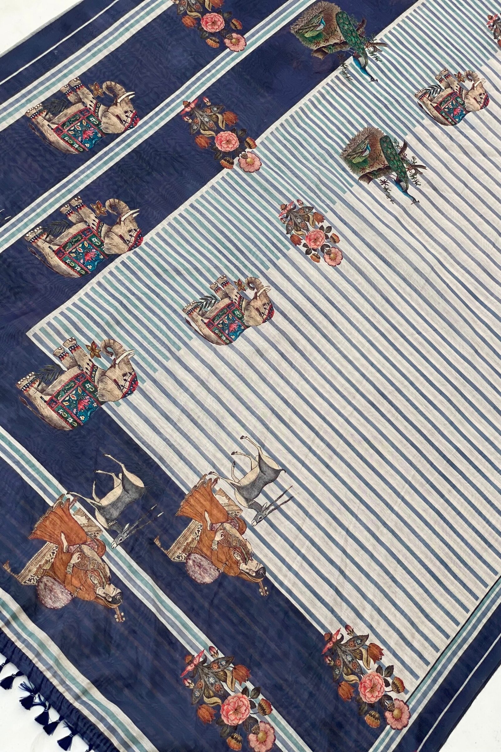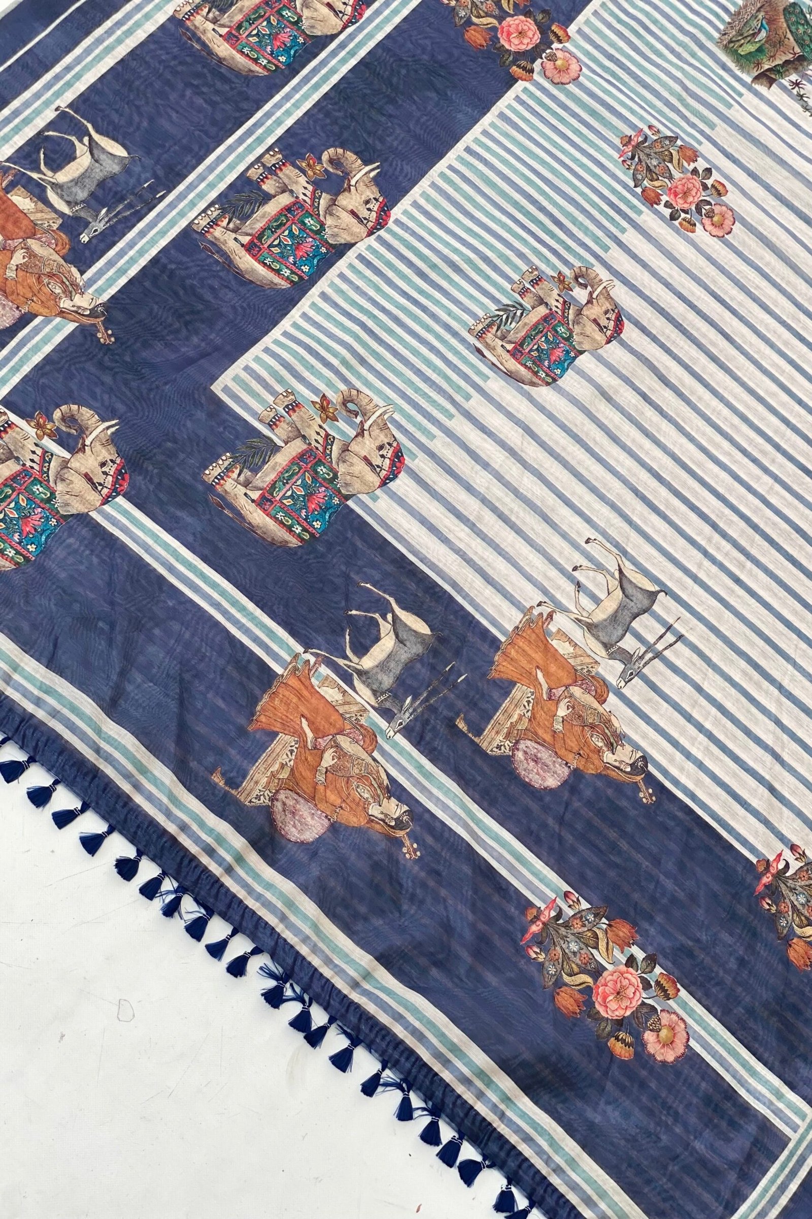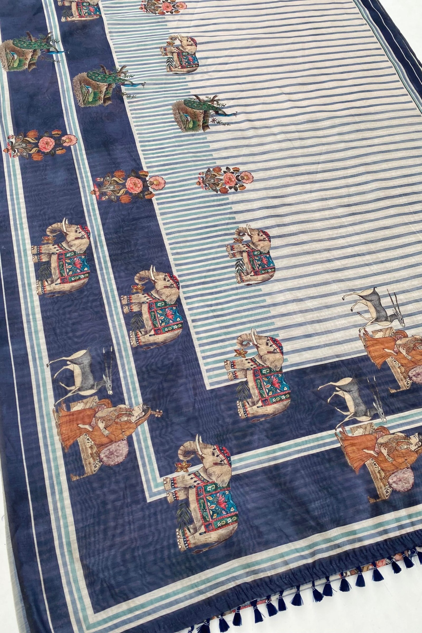 Brighten up your wardrobe with our beautiful blue stripe saree, featuring small elephants all over! Made from soft, high-quality fabric, this saree is comfortable and easy to wear.