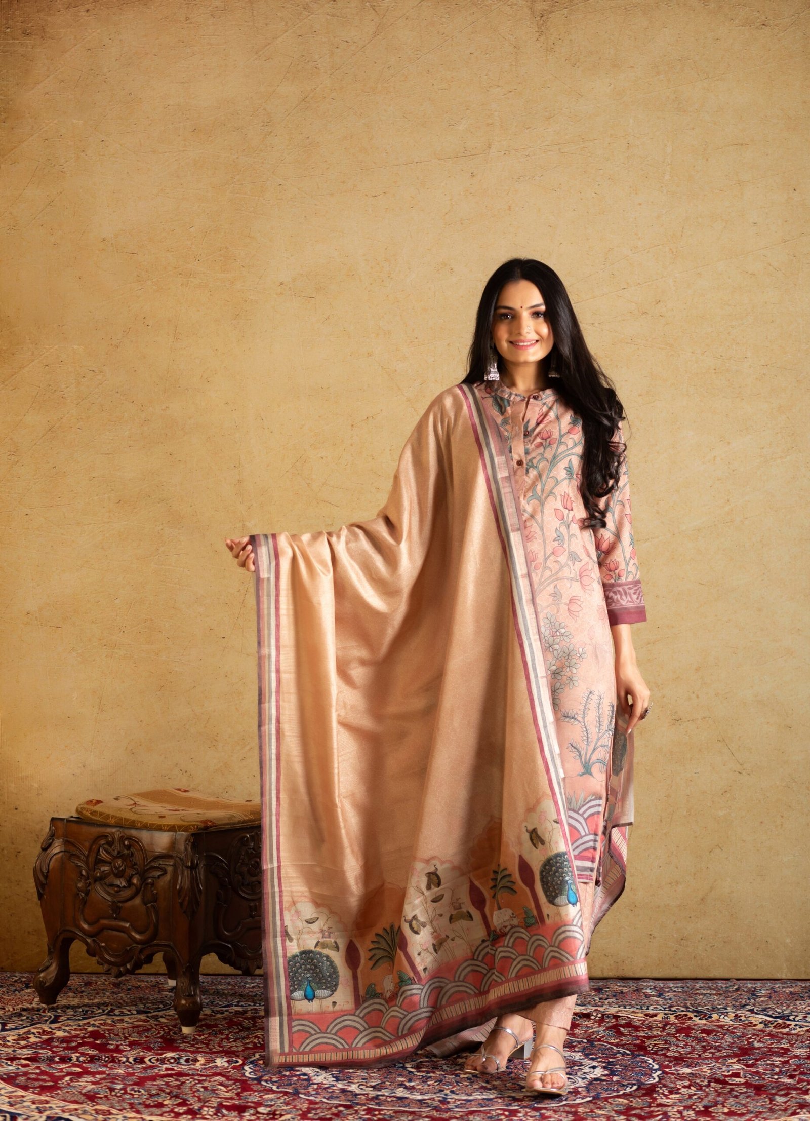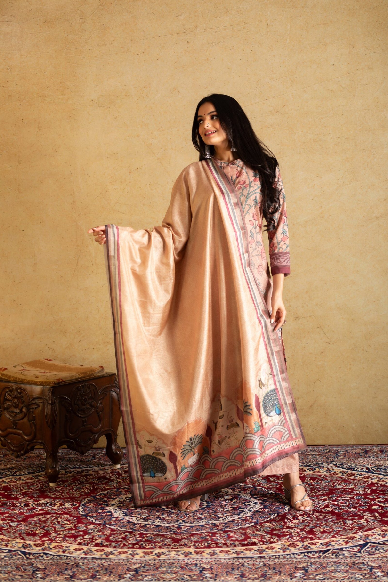 This gorgeous digitally printed dupatta Will be a perfect addition to your ethnic collection. The pichwai print adds to the beauty of this concept. Flowers gracing the border of the dupatta, like nature’s delicate touch. This dupatta is trendy yet a classic addition to your wardrobe.