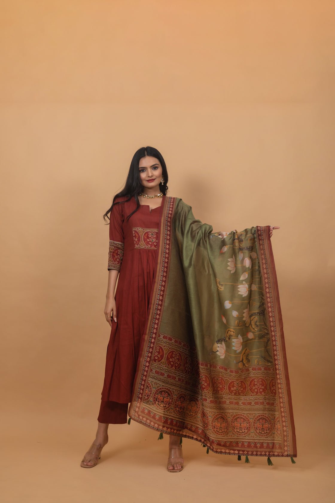 Elegant Maroon Pichwai Suit Set by Dhrupal