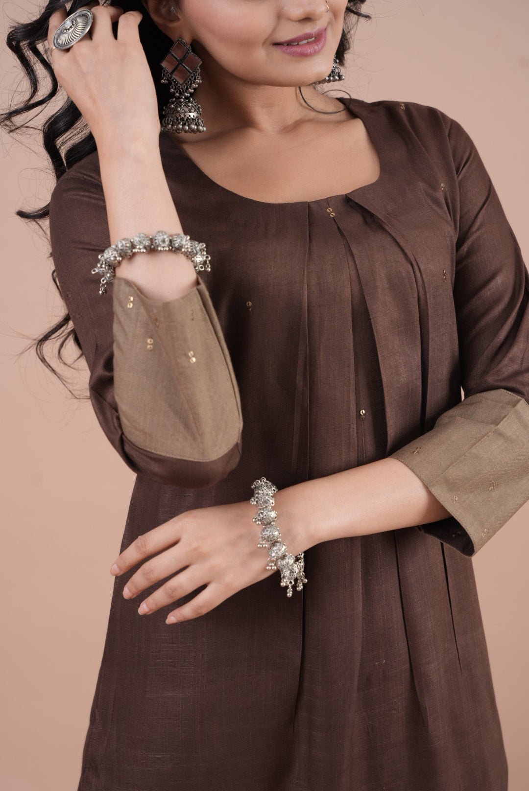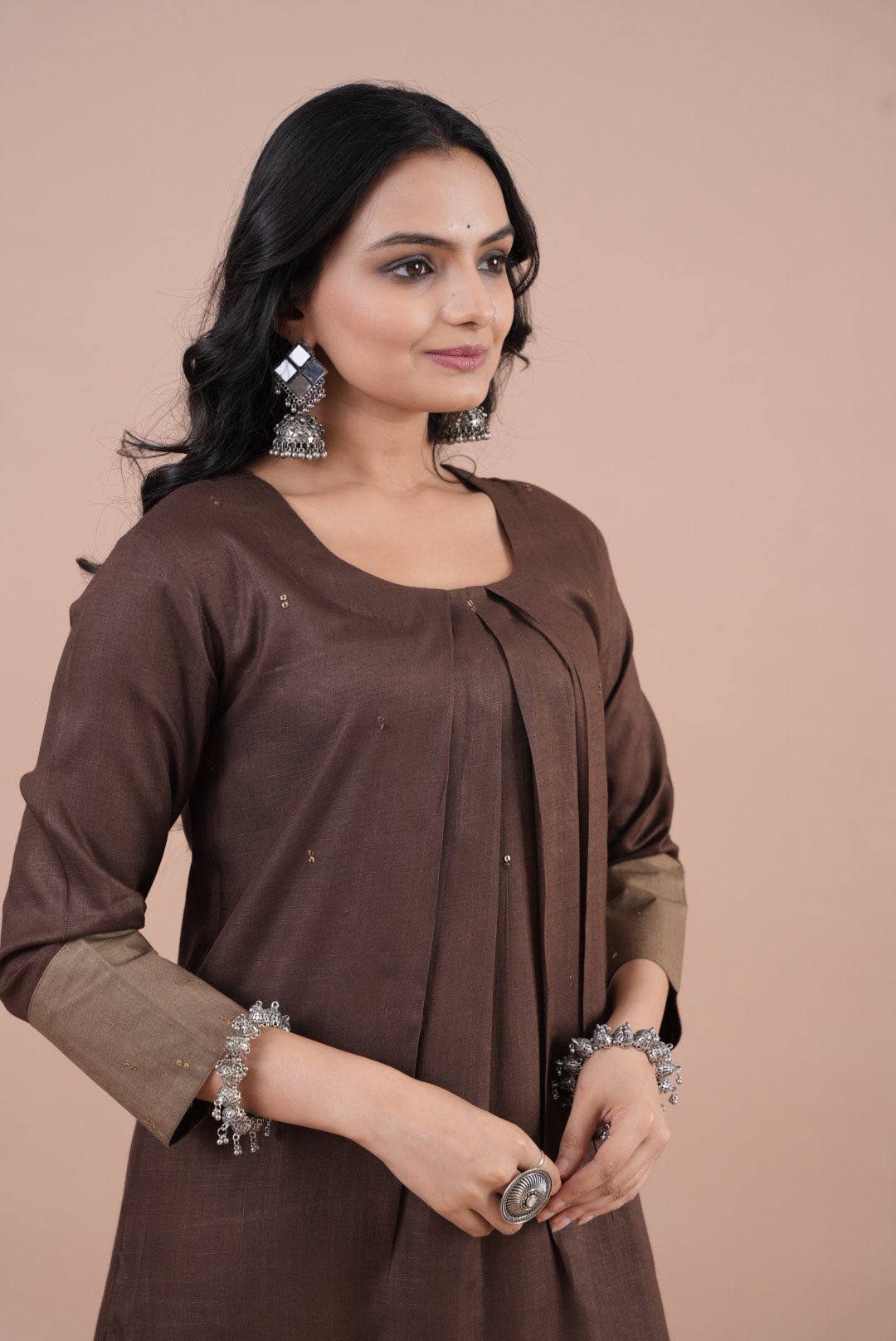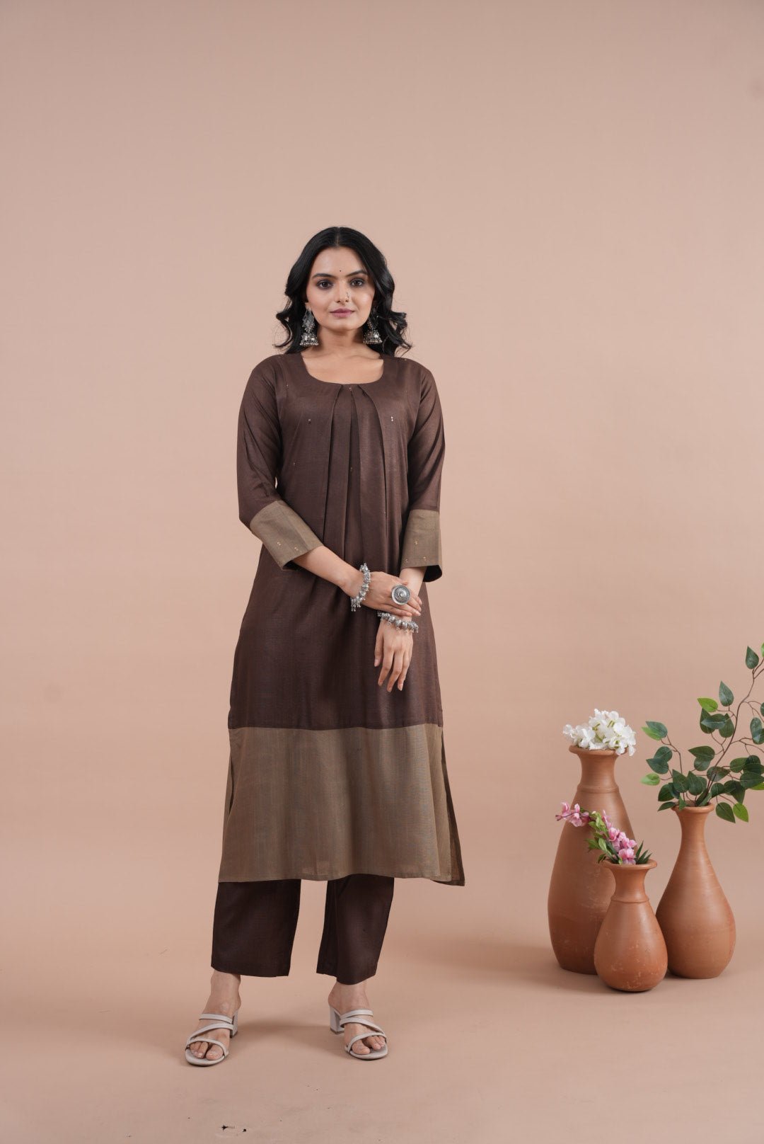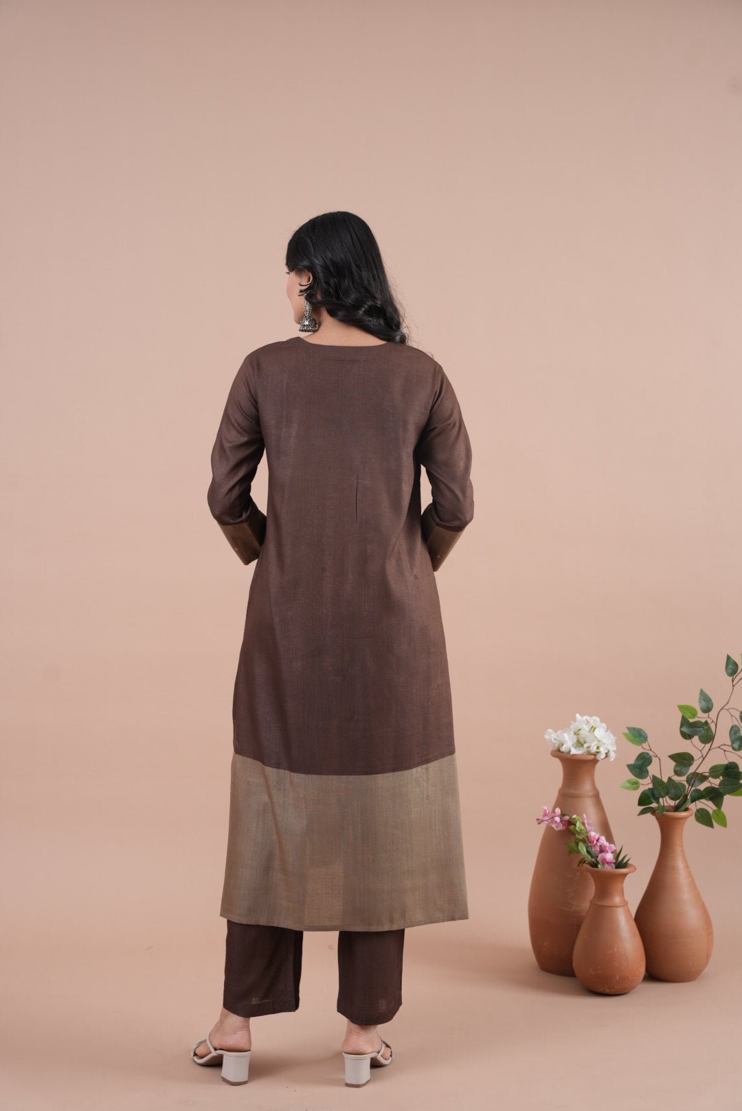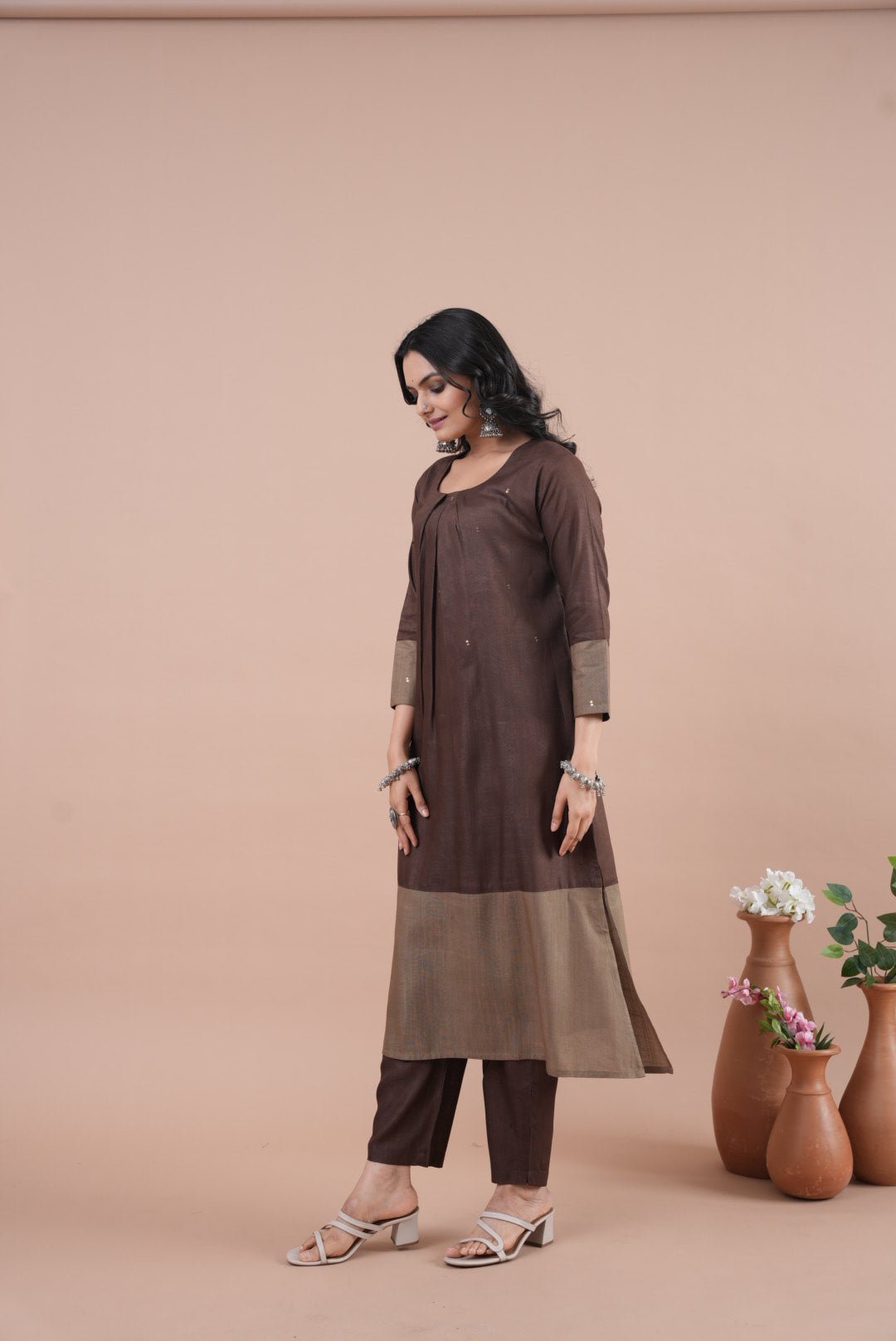 This gorgeous pure bhagalpuri kurta set is made with handcrafted fabric. The top and bottom are dyed with beautiful solid complementing colours, the Color Block Kurta Set