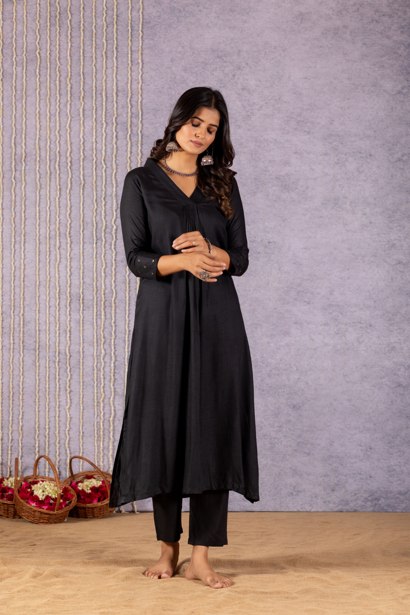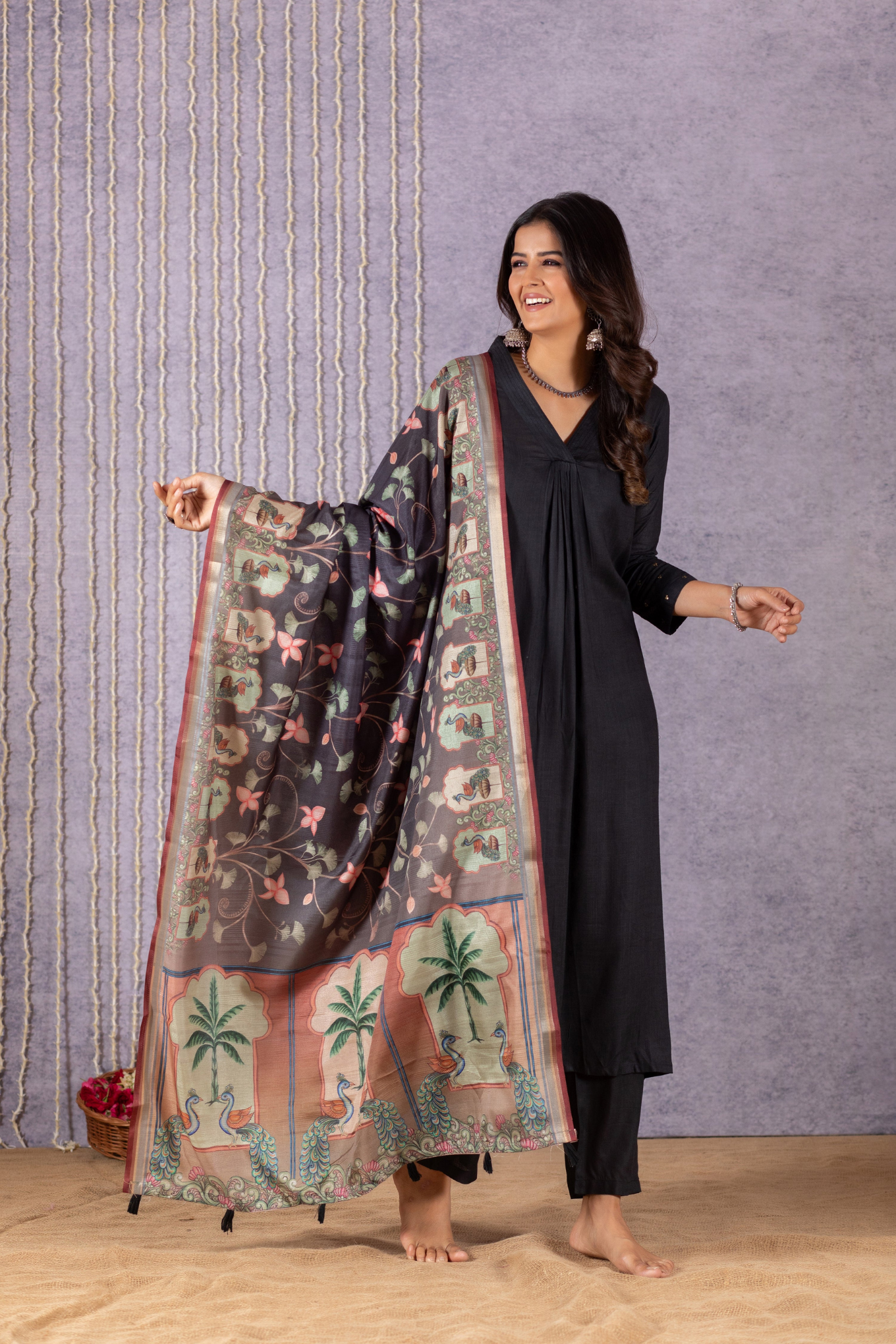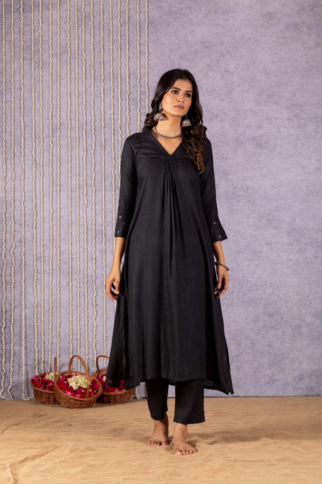 Introducing our exquisite dress, a harmonious blend of elegance and style. This stunning ensemble boasts a graceful V-neck neckline, artfully crafted pleats adorning the front of the kurta, and delicate detailing on the sleeves. Top and bottom are dyed with beautiful solid colours and comes with pichwai semi tussar silk dupatta along with tassels on each end of the dupatta.