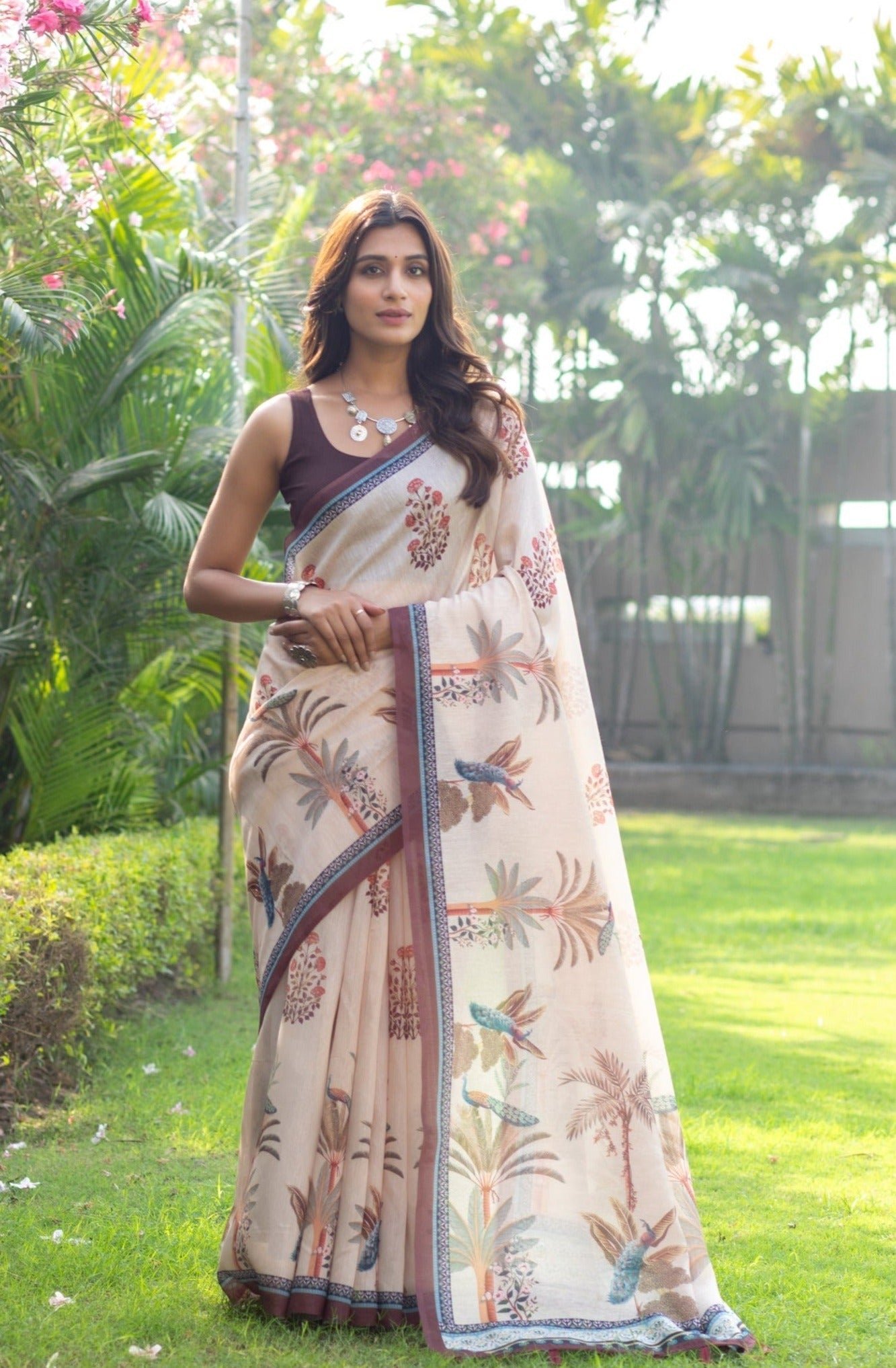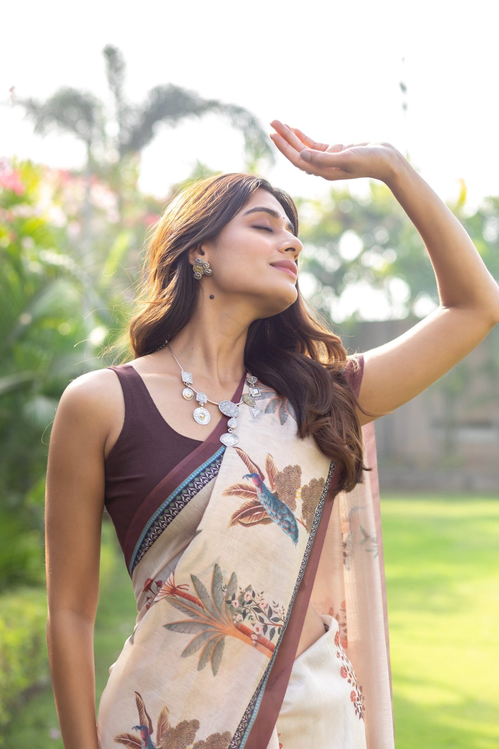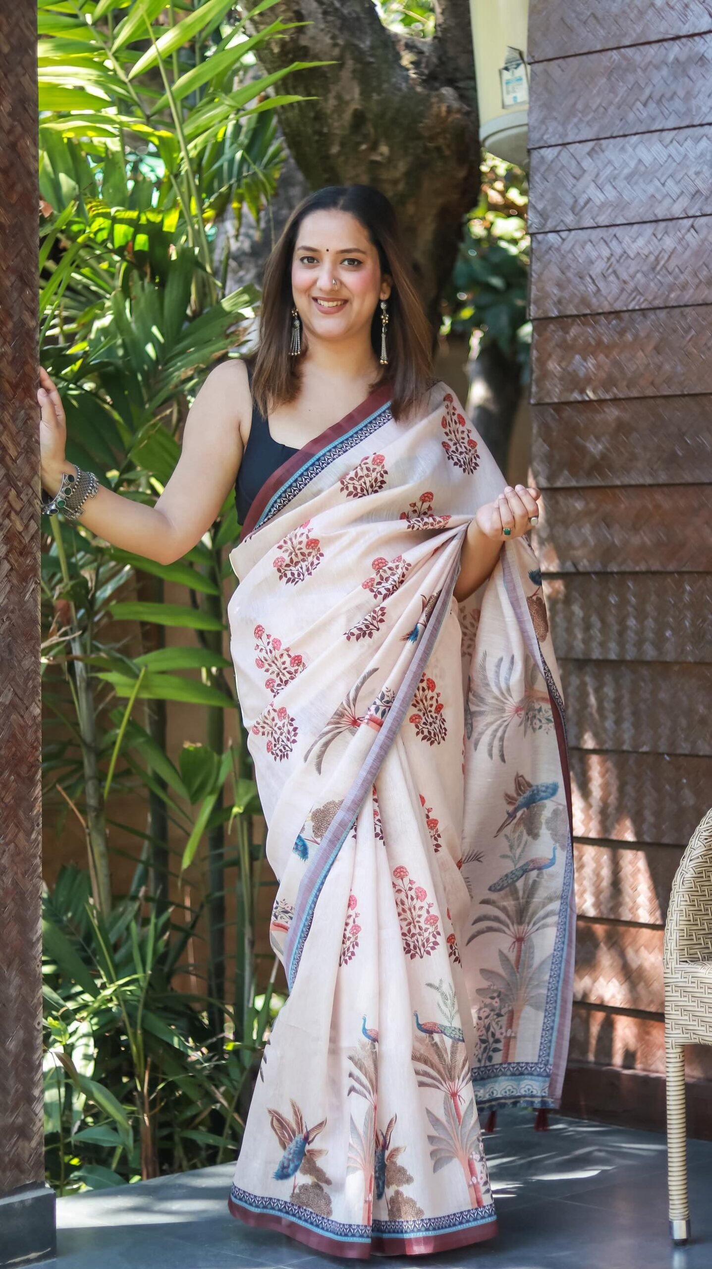 This saree is very elegant. It’s made of a special fabric called handloom cotton silk. The main part of the saree has a beautiful design called Pichwai print. There are also peacocks on the saree. They add to its beauty.The saree comes with an unstitched blouse.