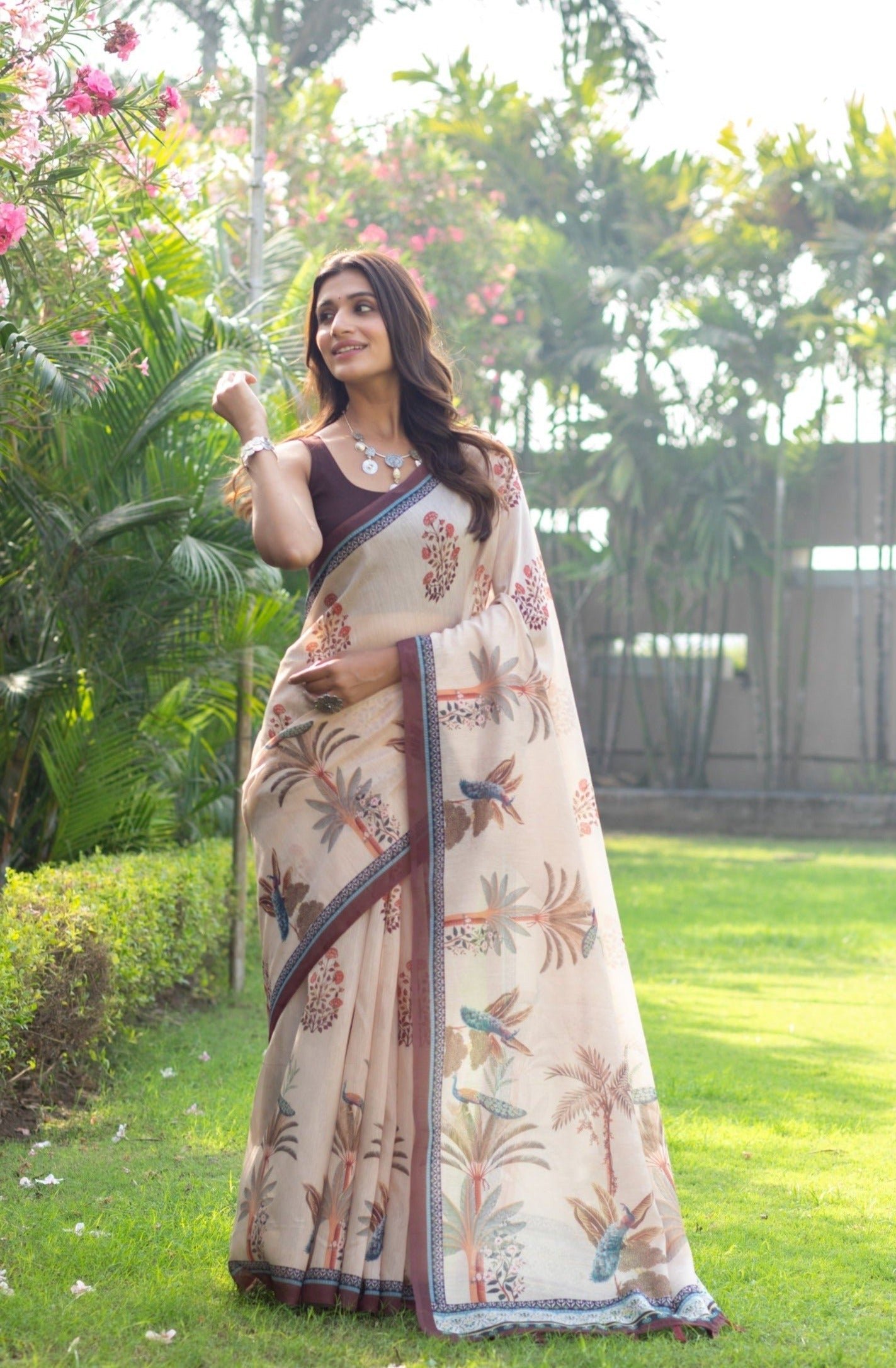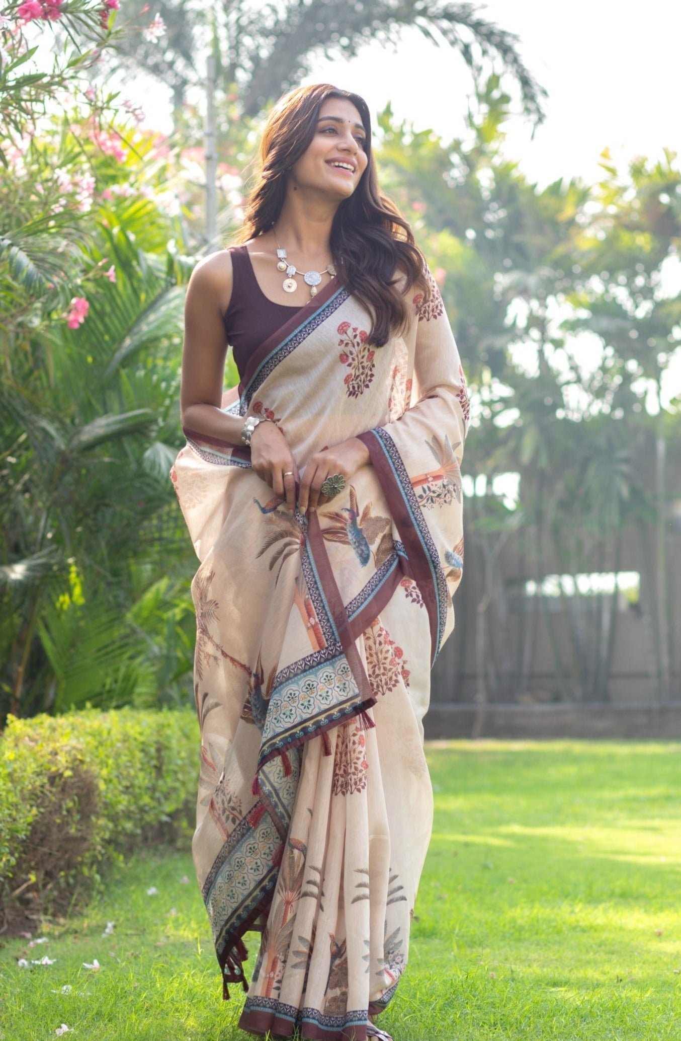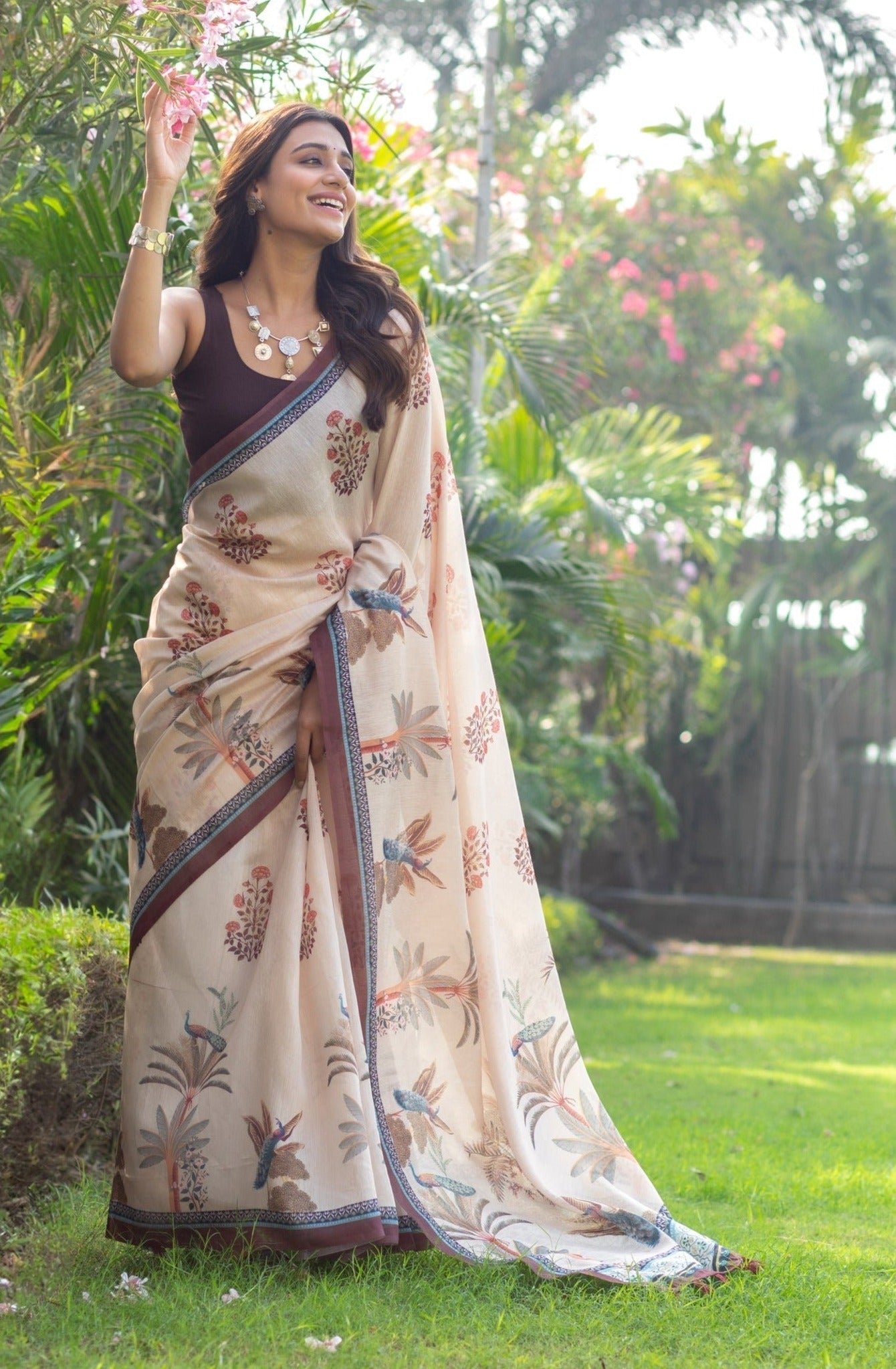 This saree is very elegant. It’s made of a special fabric called handloom cotton silk. The main part of the saree has a beautiful design called Pichwai print. There are also peacocks on the saree. They add to its beauty.The saree comes with an unstitched blouse.