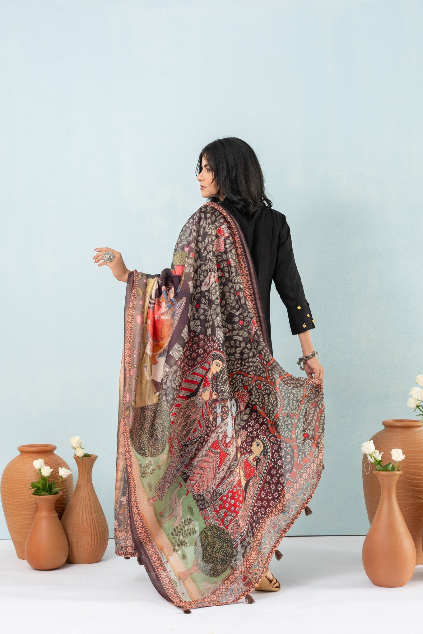 Introducing our Pure Bhagalpuri Suit Set in solid black. The top features intricate handwork on the collar V-neck and sleeves, showcasing exquisite craftsmanship. Paired with a stunning Pichwai dupatta, this set blends tradition with modern elegance, making it a perfect choice for any occasion.