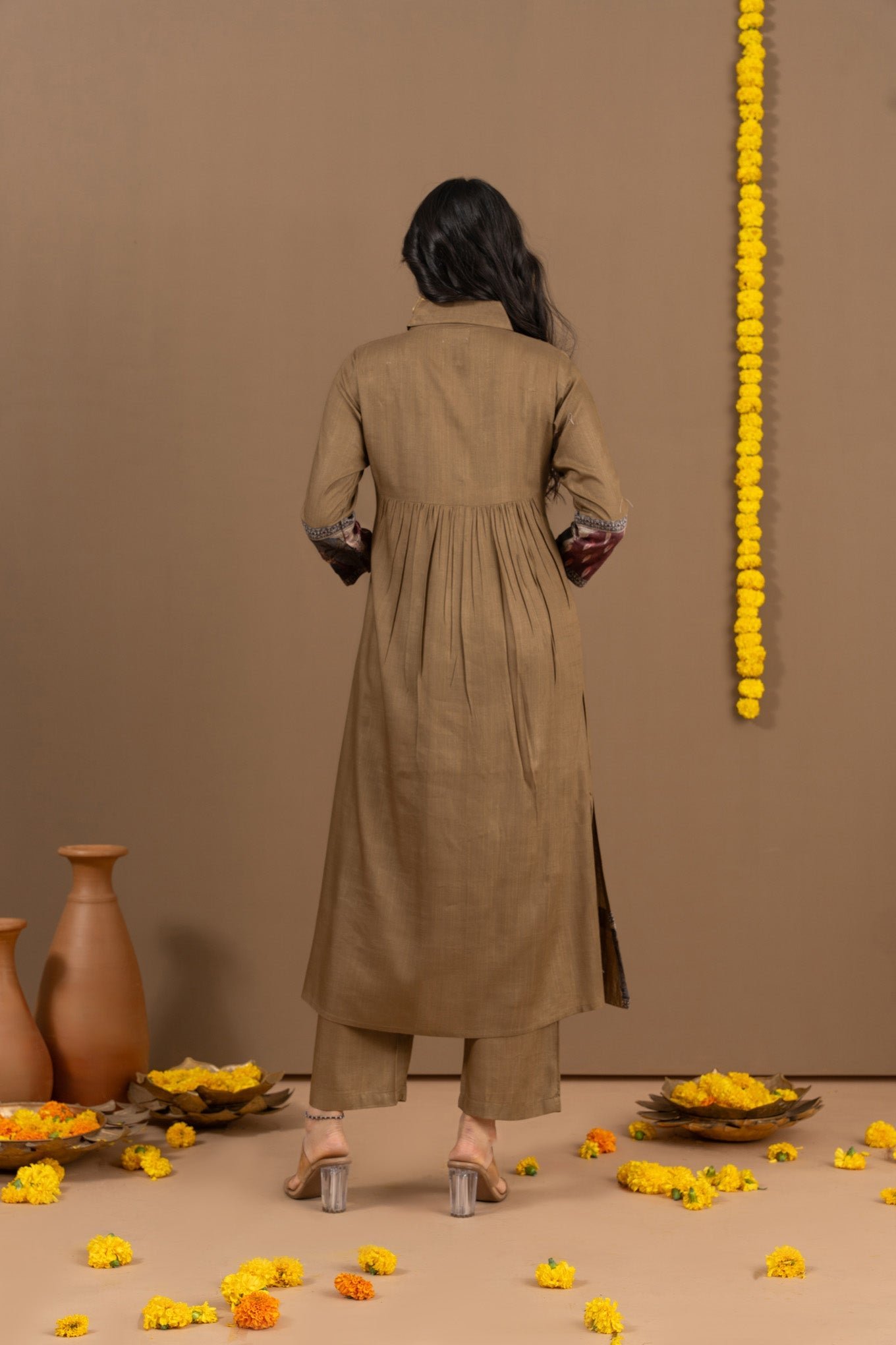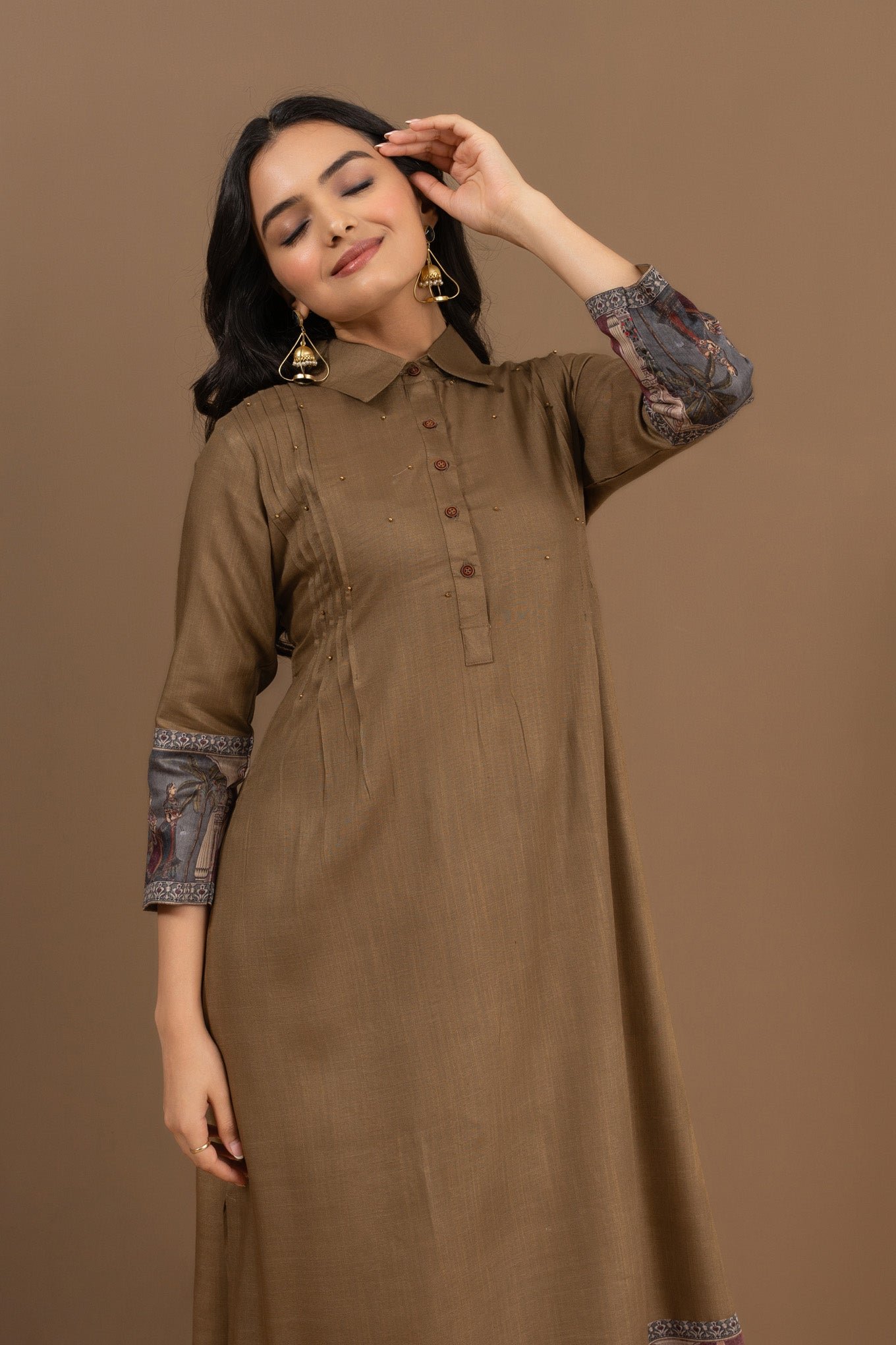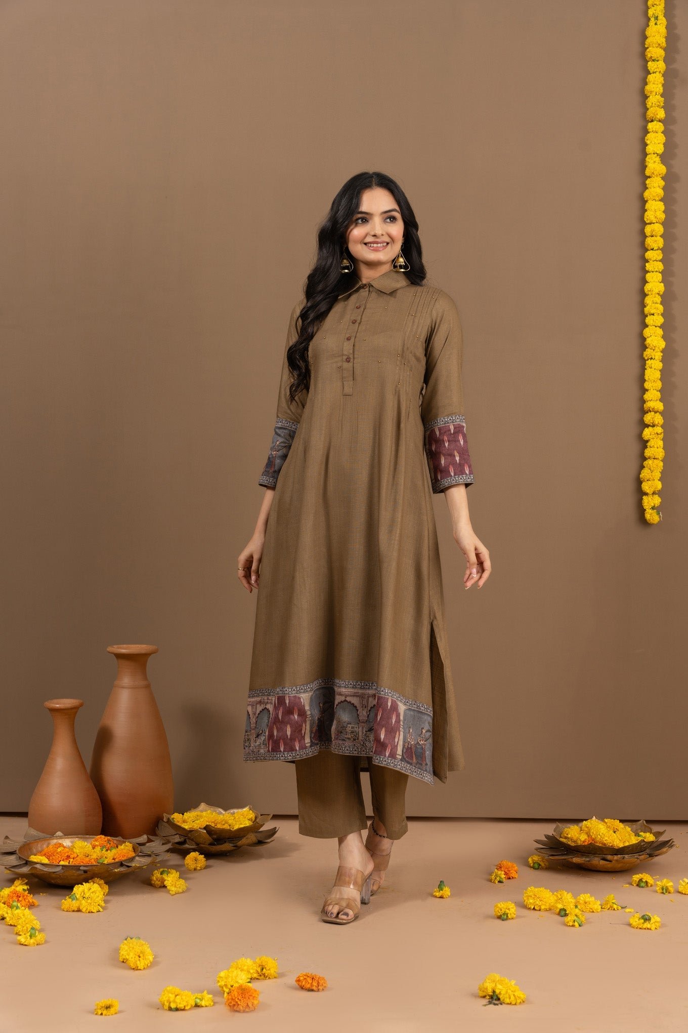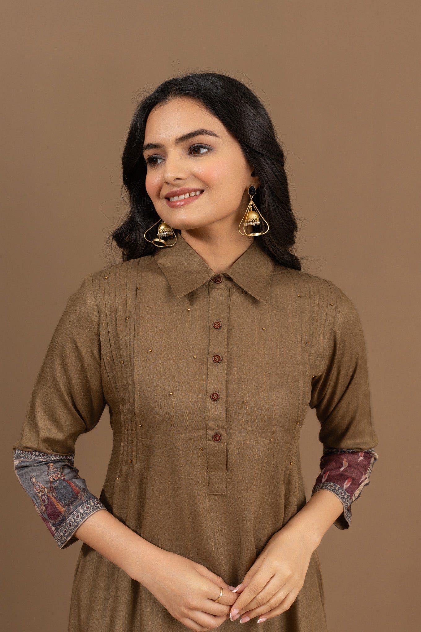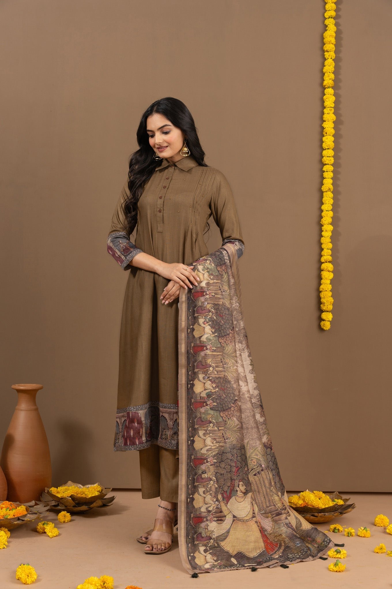 Discover elegance with our new Bhagalpuri suit set in a beautiful solid brown colour. The kurta features beautiful handwork around the neck and a stylish collar design. Kurta comes with pichwai patchwork on the bottom. It comes with a beige dupatta that adds a nice contrast. This set combines traditional style with a modern look, perfect for any occasion.