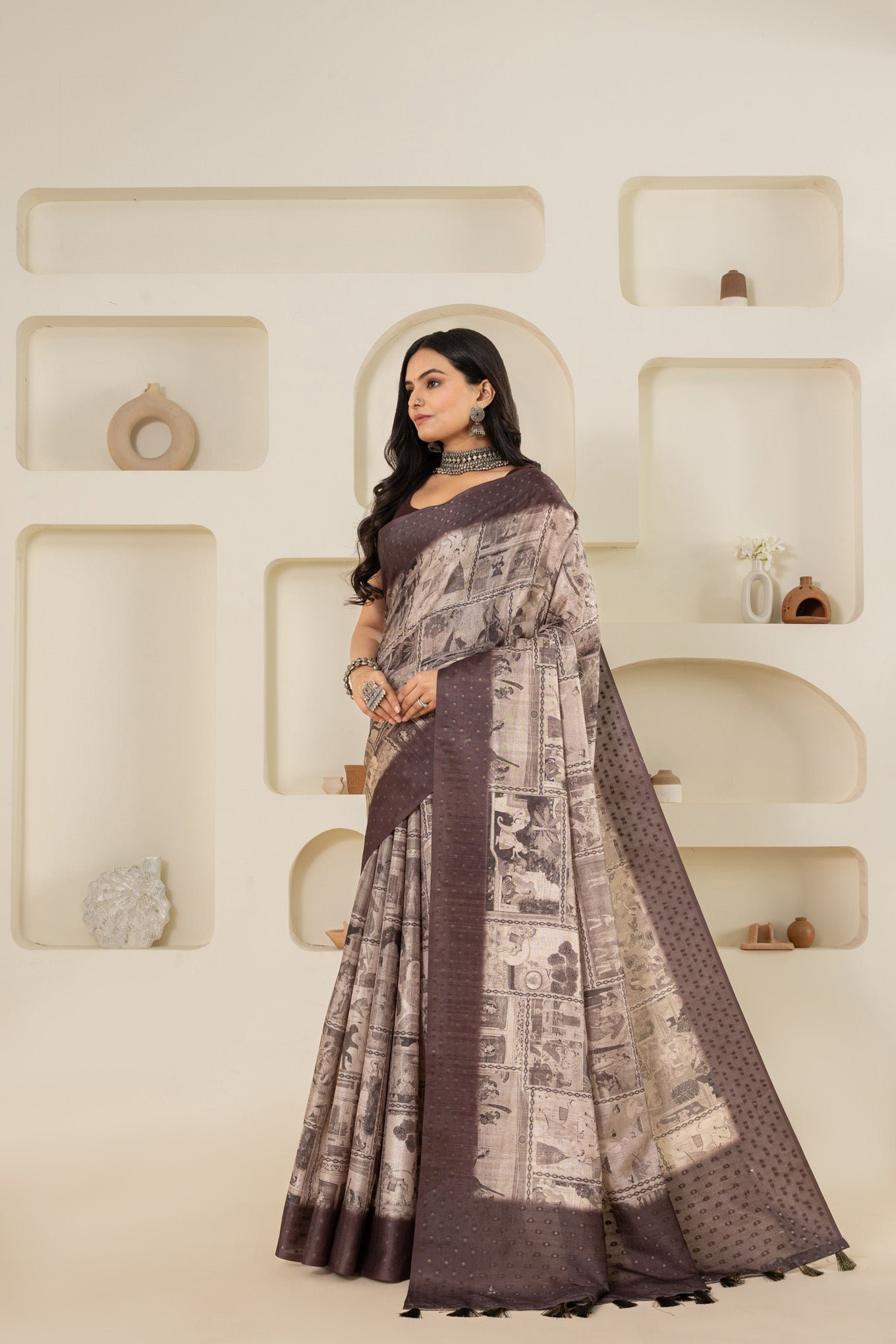 Step into elegance with this striking black and white beige saree, a masterpiece featuring a blend of traditional Pichwai and Mughal-inspired prints. The saree is adorned with intricate block prints that add depth and a touch of classic charm. Perfect for evening events, festive occasions, and cultural celebrations, this saree combines the timeless appeal of heritage art with a modern color palette. Crafted from high-quality fabric, it offers both sophistication and comfort, making it an ideal choice for those who appreciate the beauty of traditional prints with a contemporary twist.