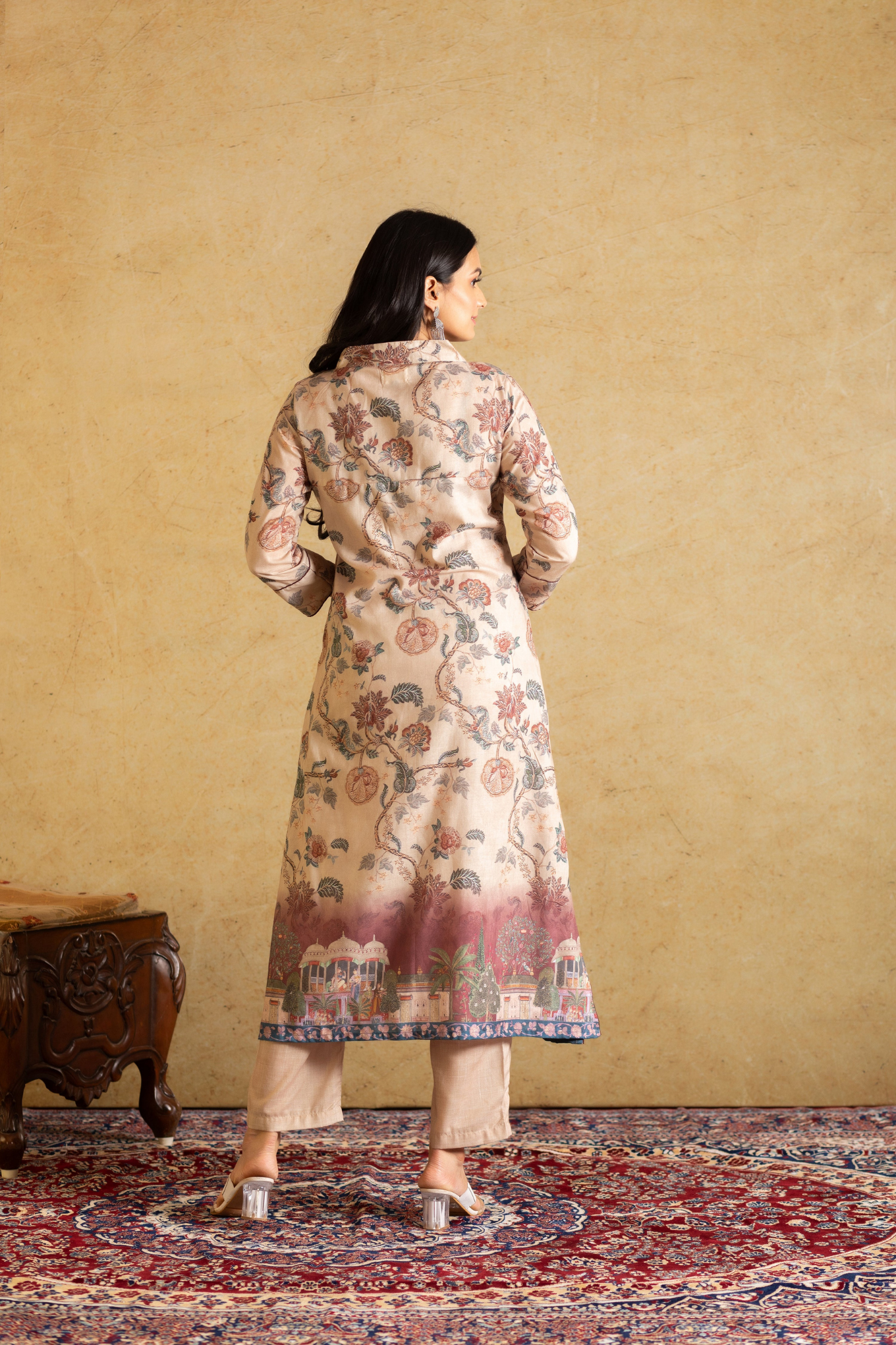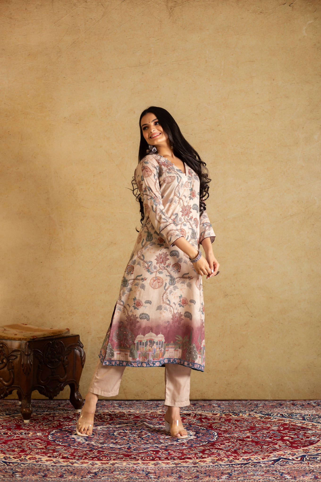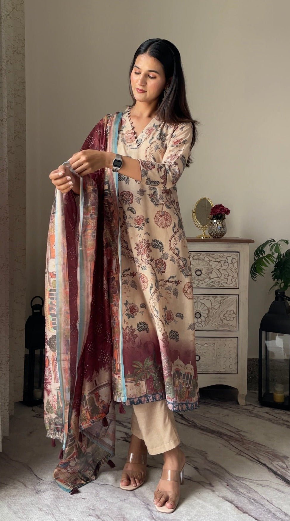 Experience elegance and tradition seamlessly woven into one with our straight suit set. The V-neck kurta adorned with intricate Kalamkari prints perfectly complements the Bandhej print dupatta, creating a timeless fusion of style and heritage. Digitally printed kurta and pant comes with beautiful kalamkari print and dupatta. It is a soft cotton top bottom with handloom cotton silk dupatta.