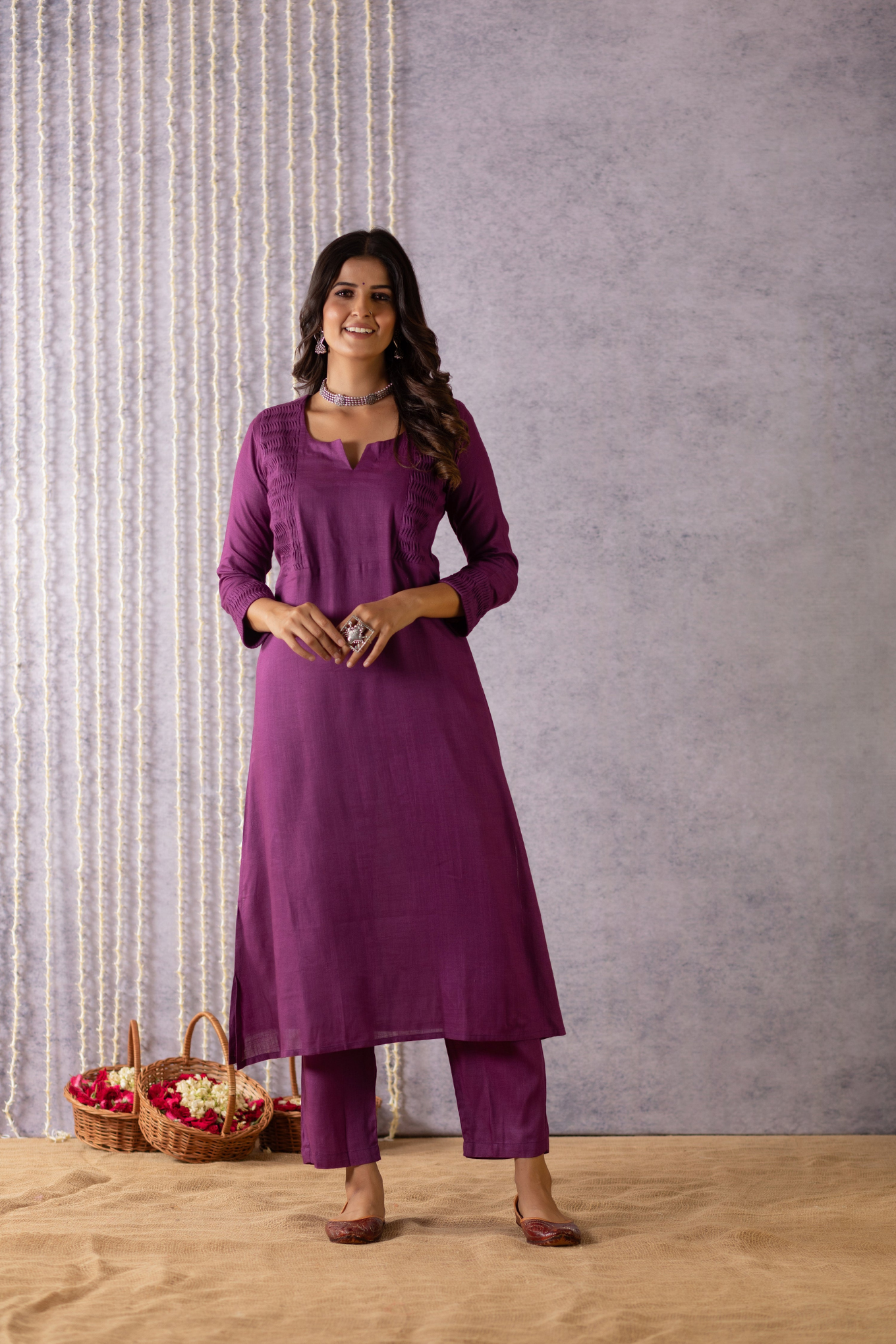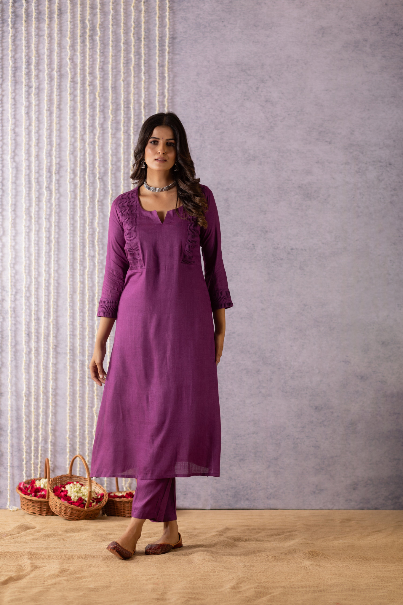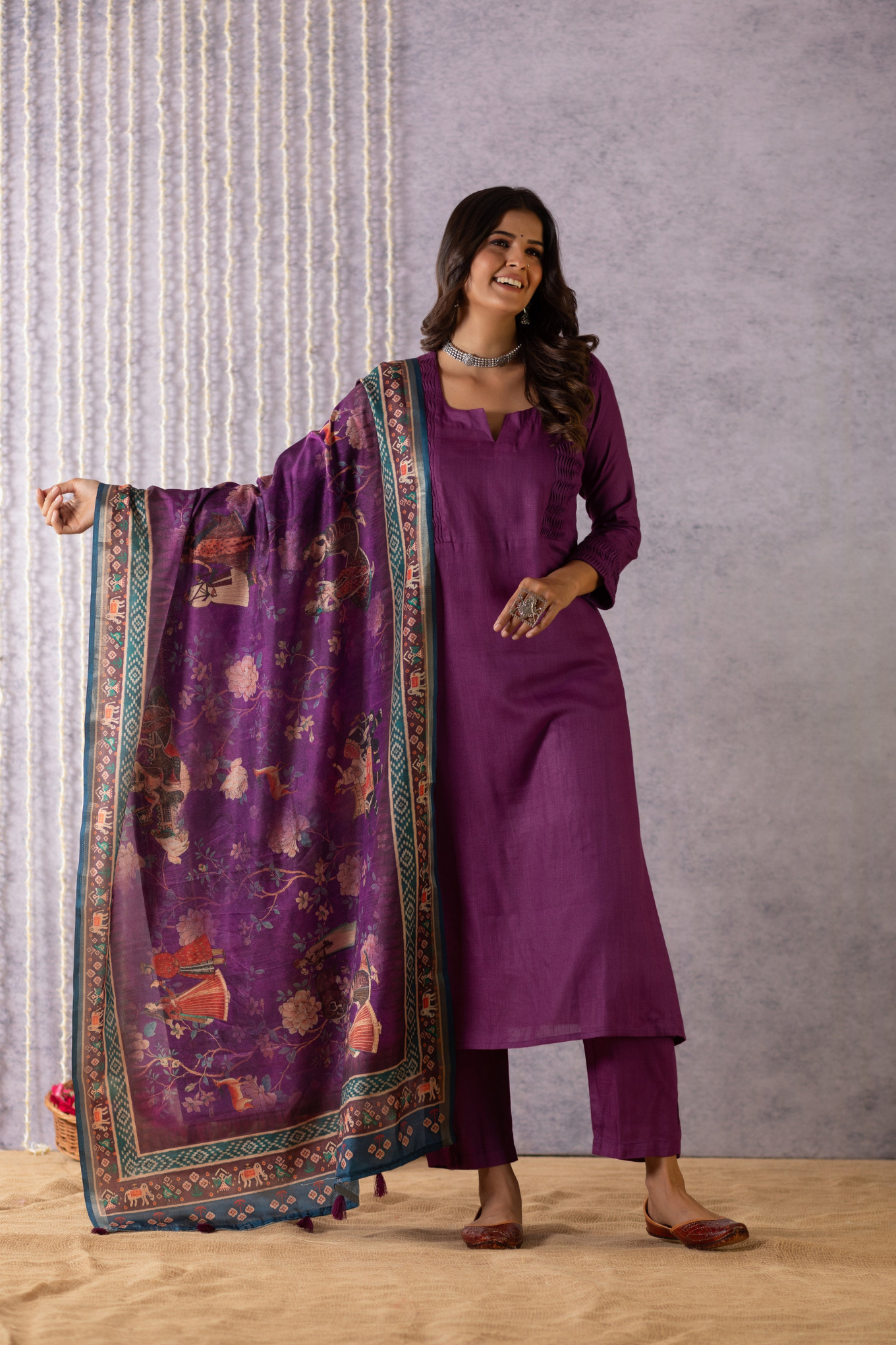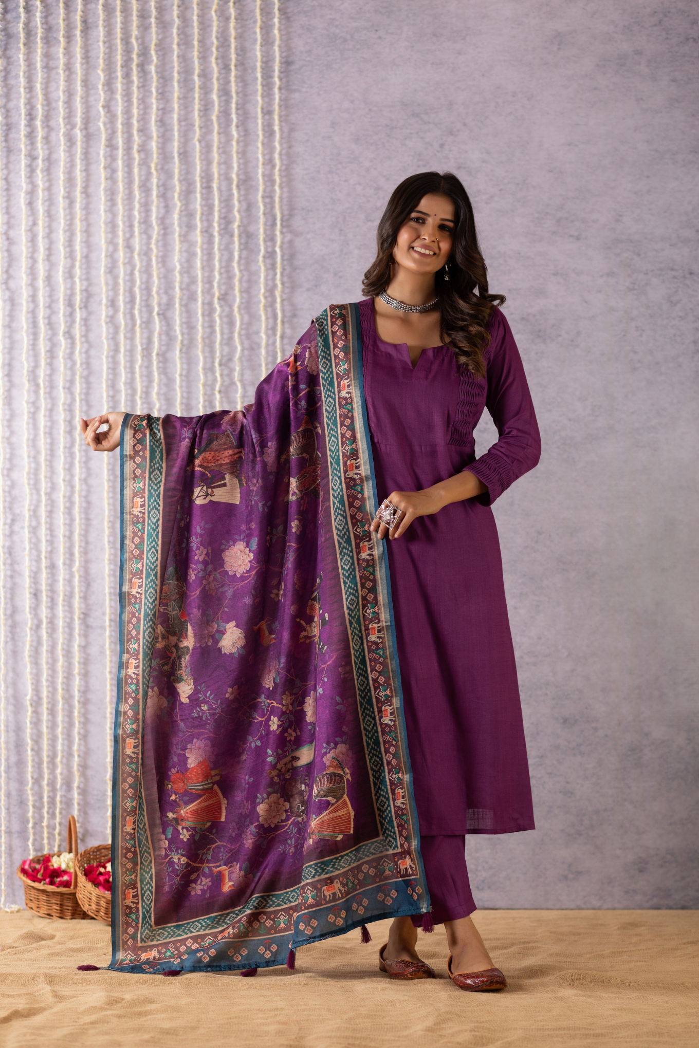 This gorgeous pure bhagalpuri suit set is made with handcrafted fabric. This plain purple suit set comes with pleated pattern on the sleeves and neck. The top and bottom are dyed with beautiful solid colours and come with a phad painting semi-tussar silk dupatta along with tassels on each end of the dupatta.