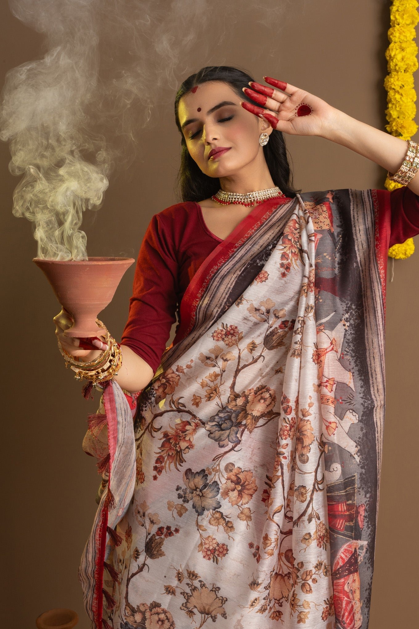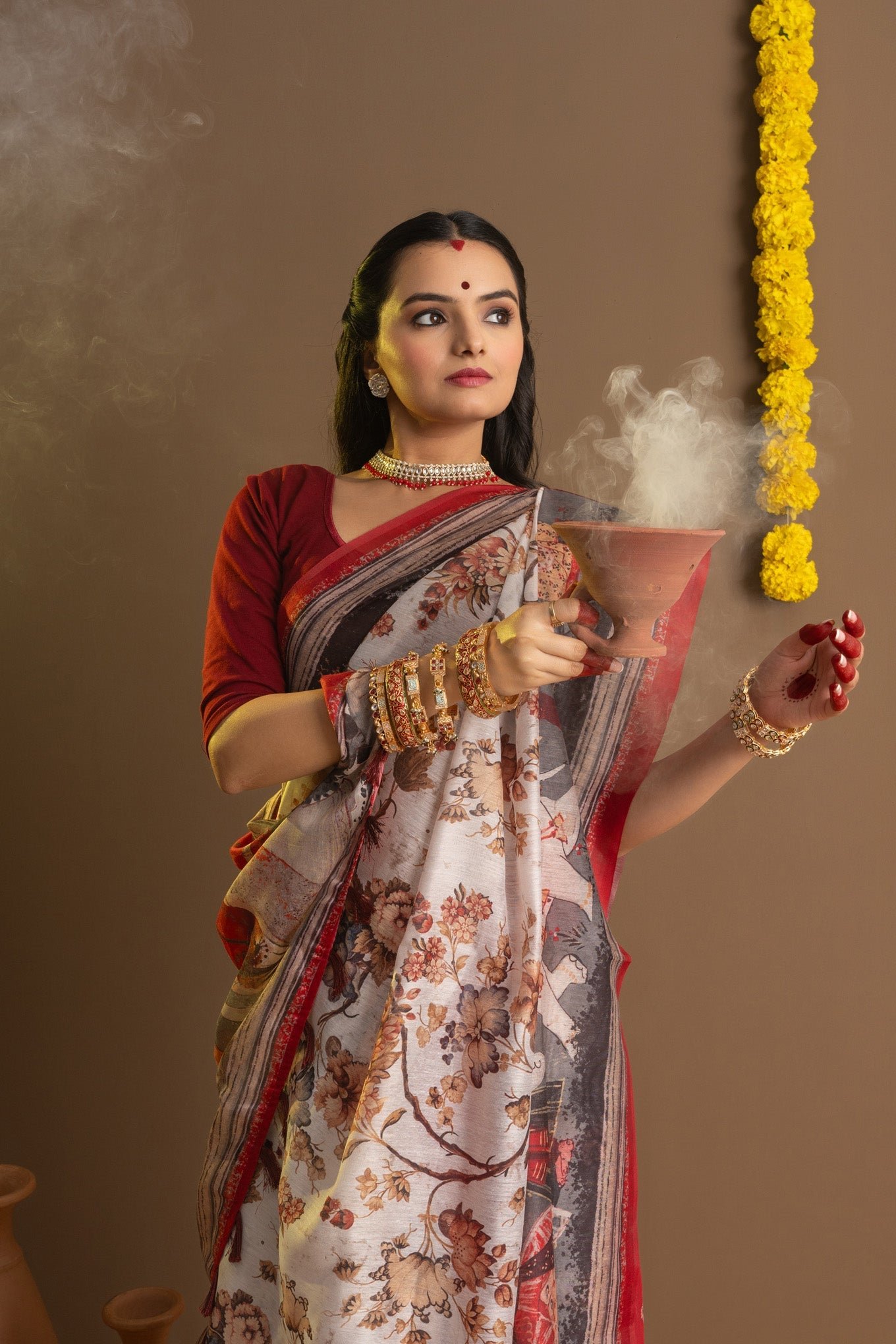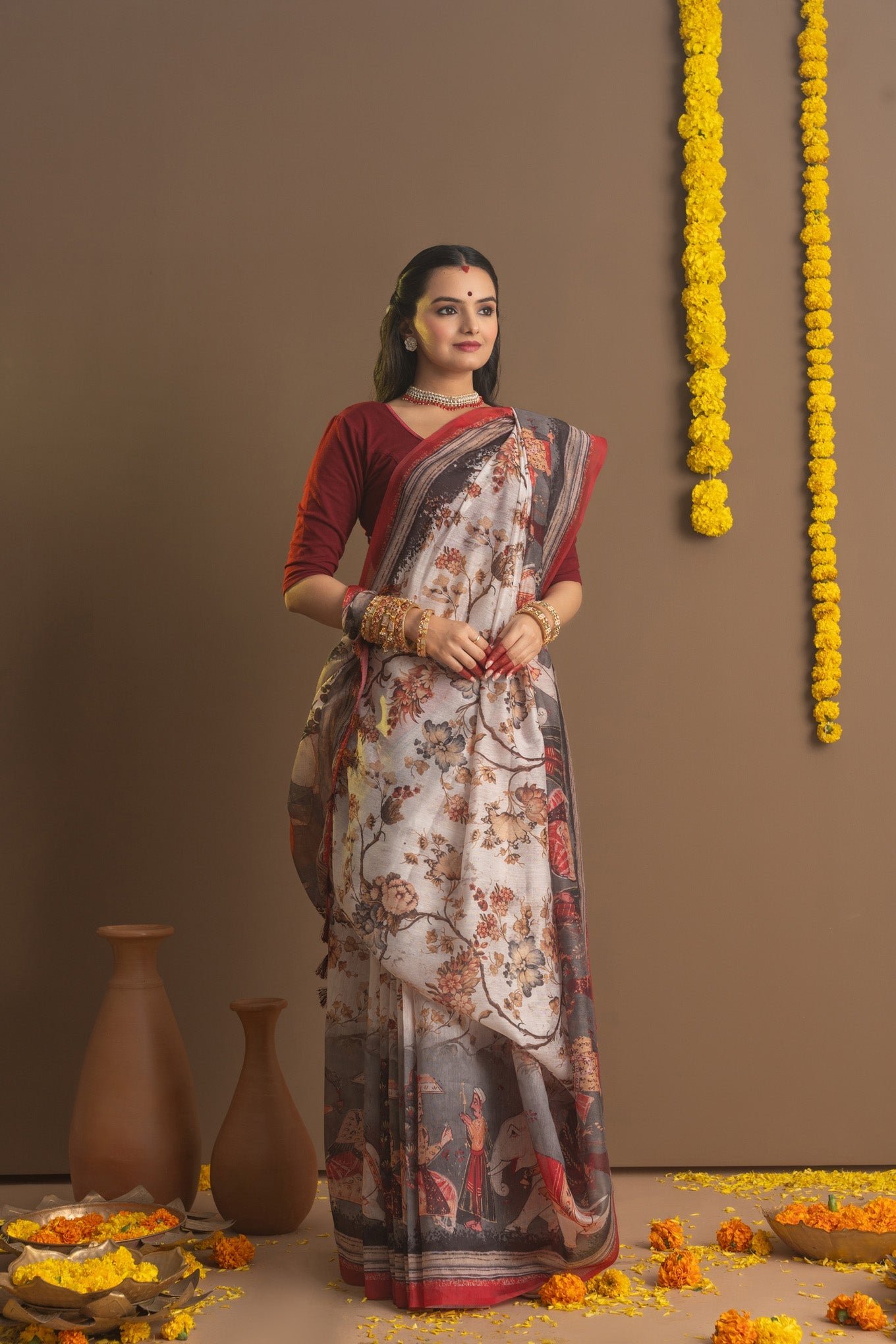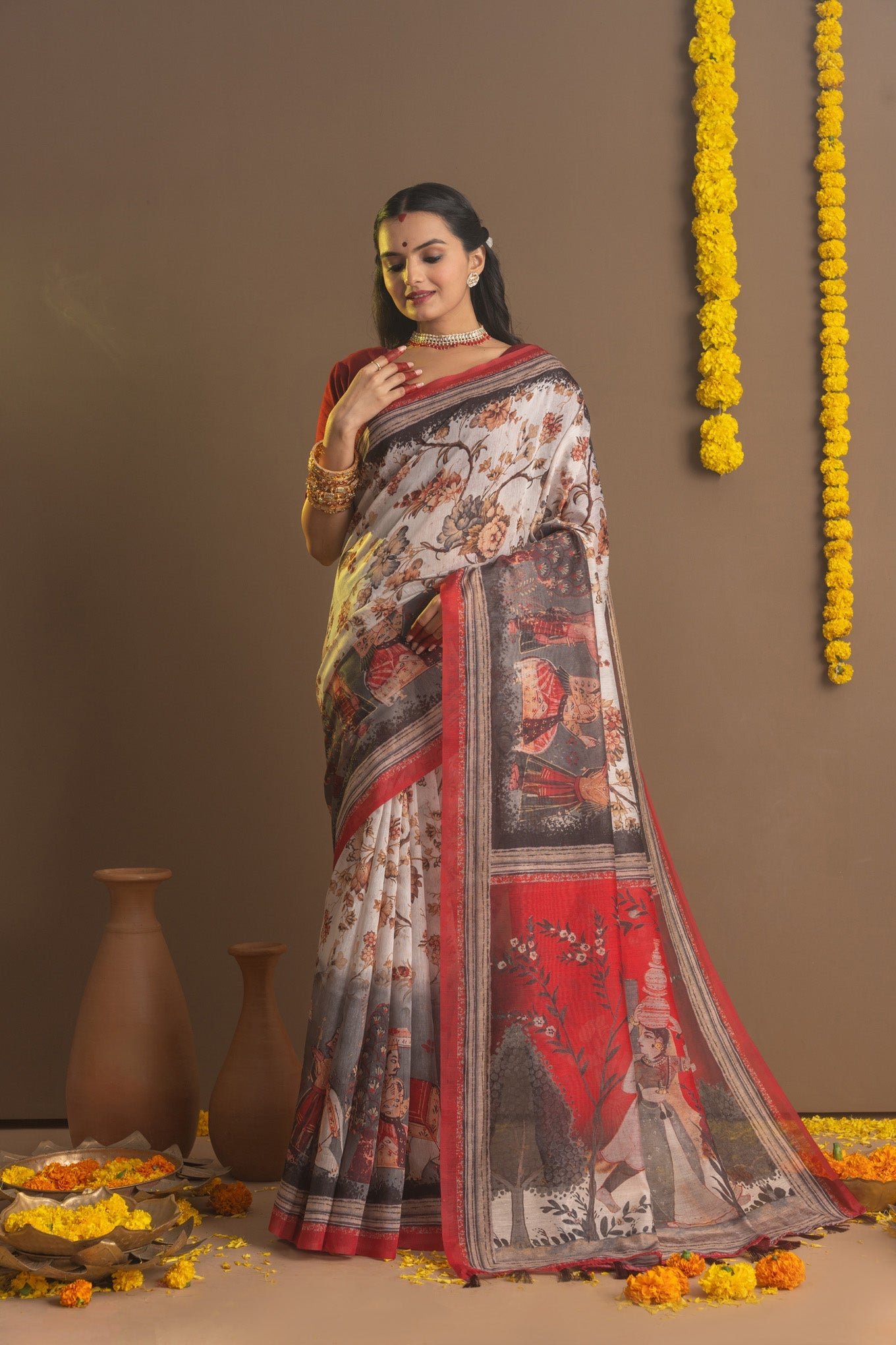 Introducing our exclusive Shubho Pujo Series Sarees from Ekana Label, designed to embody the festive spirit and traditional elegance of Durga Puja. Each ethnic saree in this collection features exquisite designs with intricate floral patterns or beautiful figures woven into the fabric, capturing the essence of celebration. Adorned in striking red and white hues, these luxury sarees honor the vibrant traditions of Durga Puja. The pallu showcases stunning artistic figures, adding a touch of grandeur to your festive attire. Embrace the charm and cultural richness of Durga Puja with these timeless Indian ethnic wear sarees, perfect for celebrating the festival in style. The saree comes with an unstitched blouse.