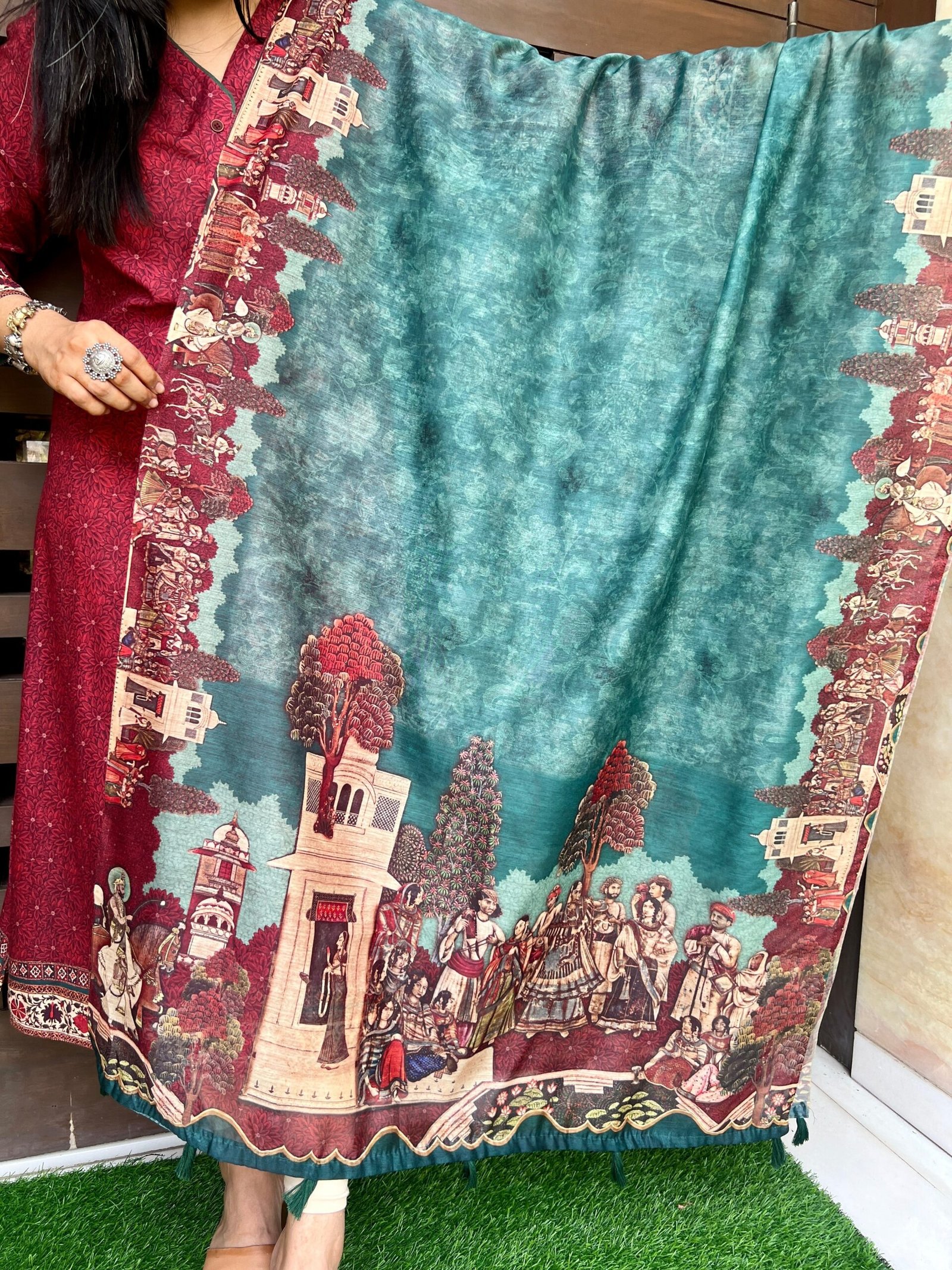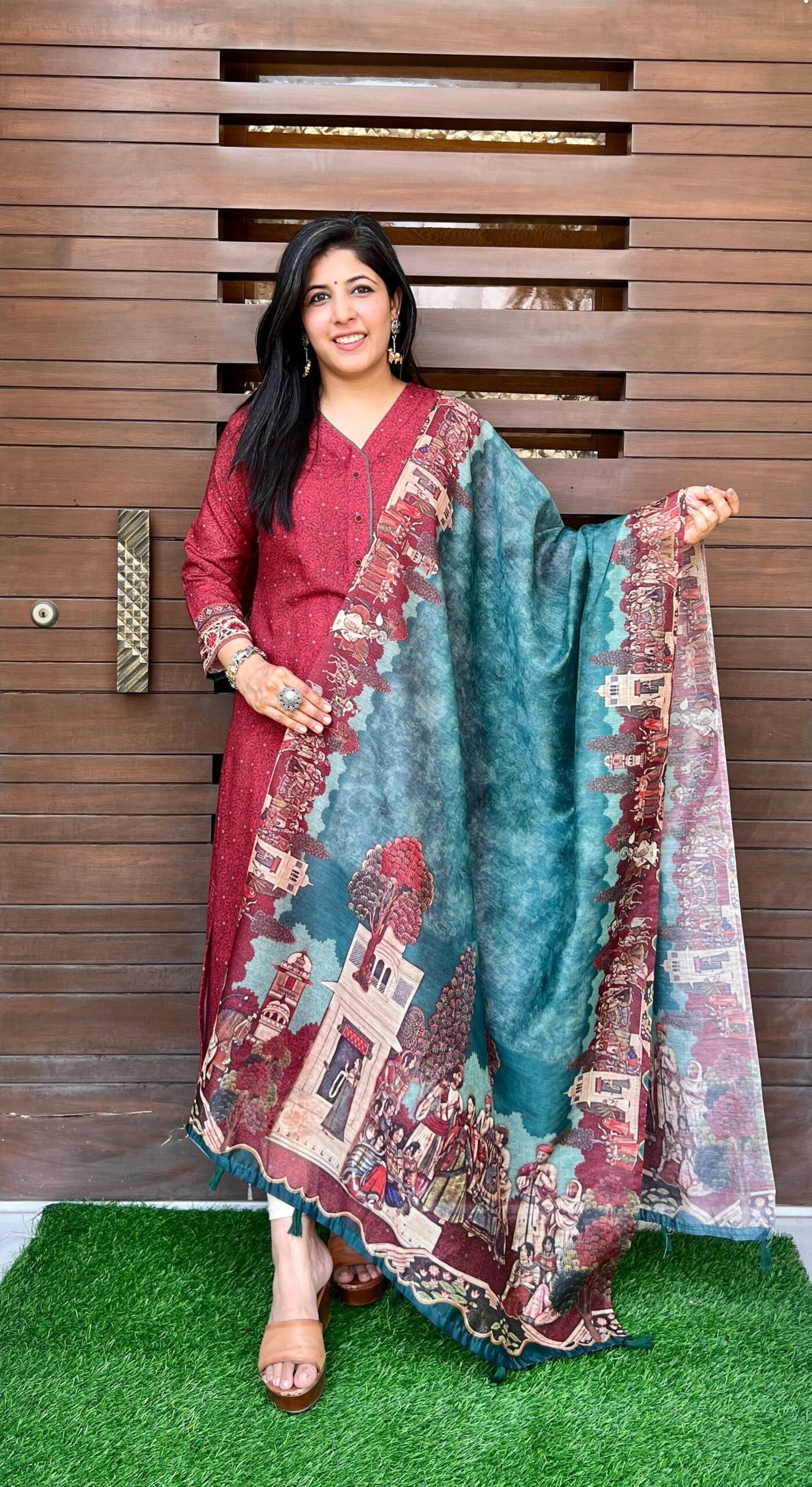 This gorgeous digitally printed dupatta Will be a perfect addition to your ethnic collection. The kalamkari print adds to the beauty of this concept. This dupatta is trendy yet a classic addition to your wardrobe.