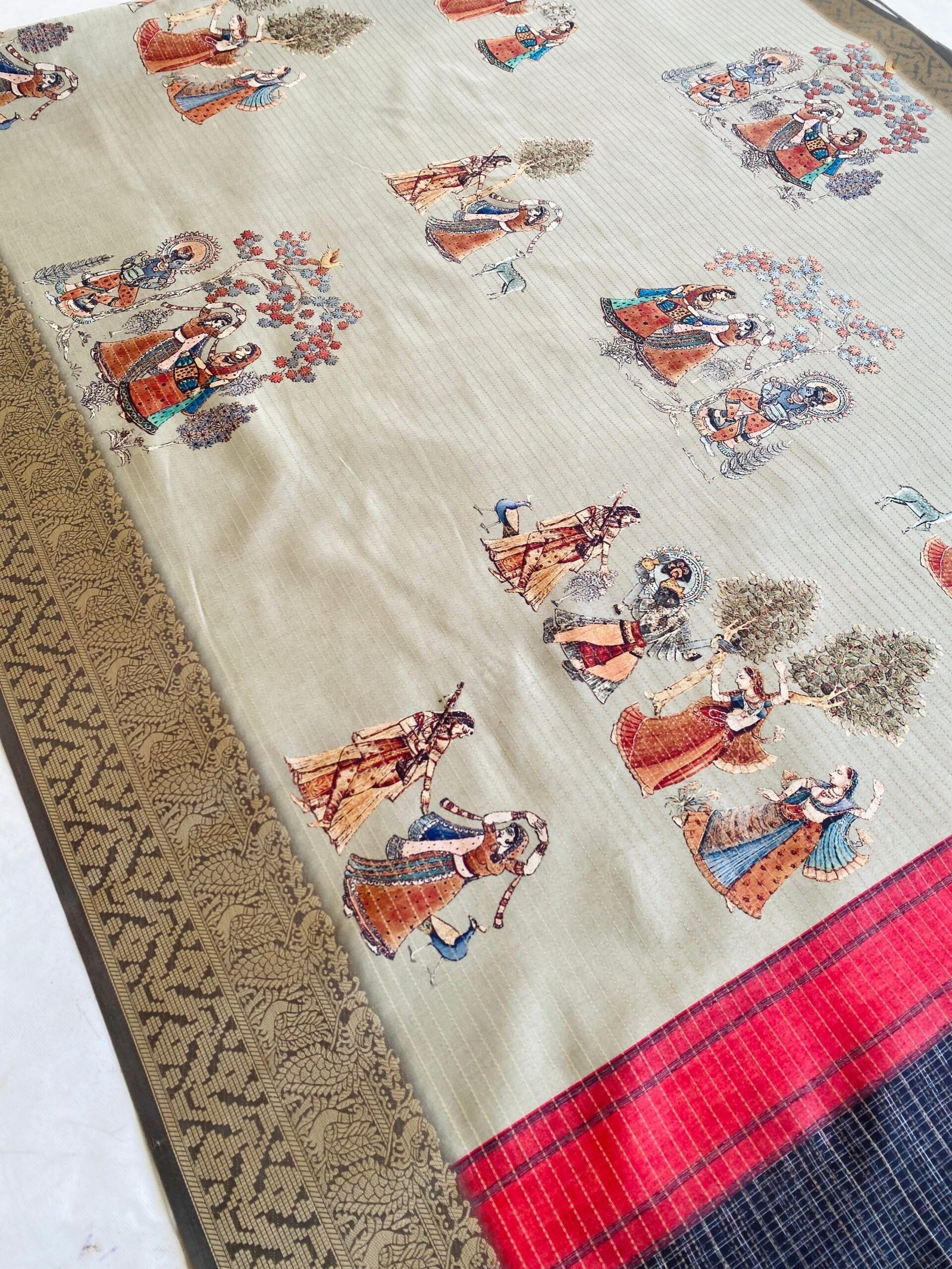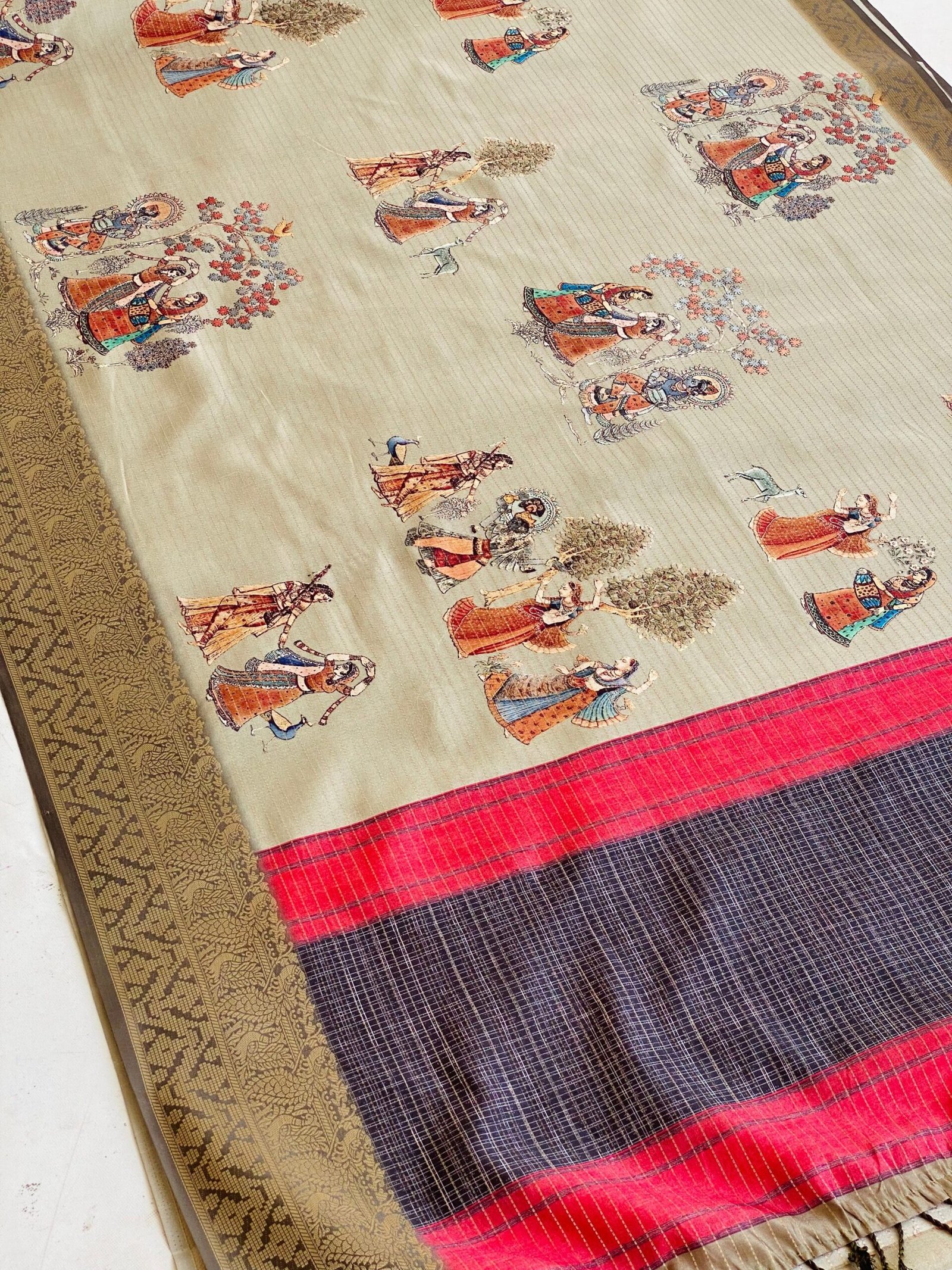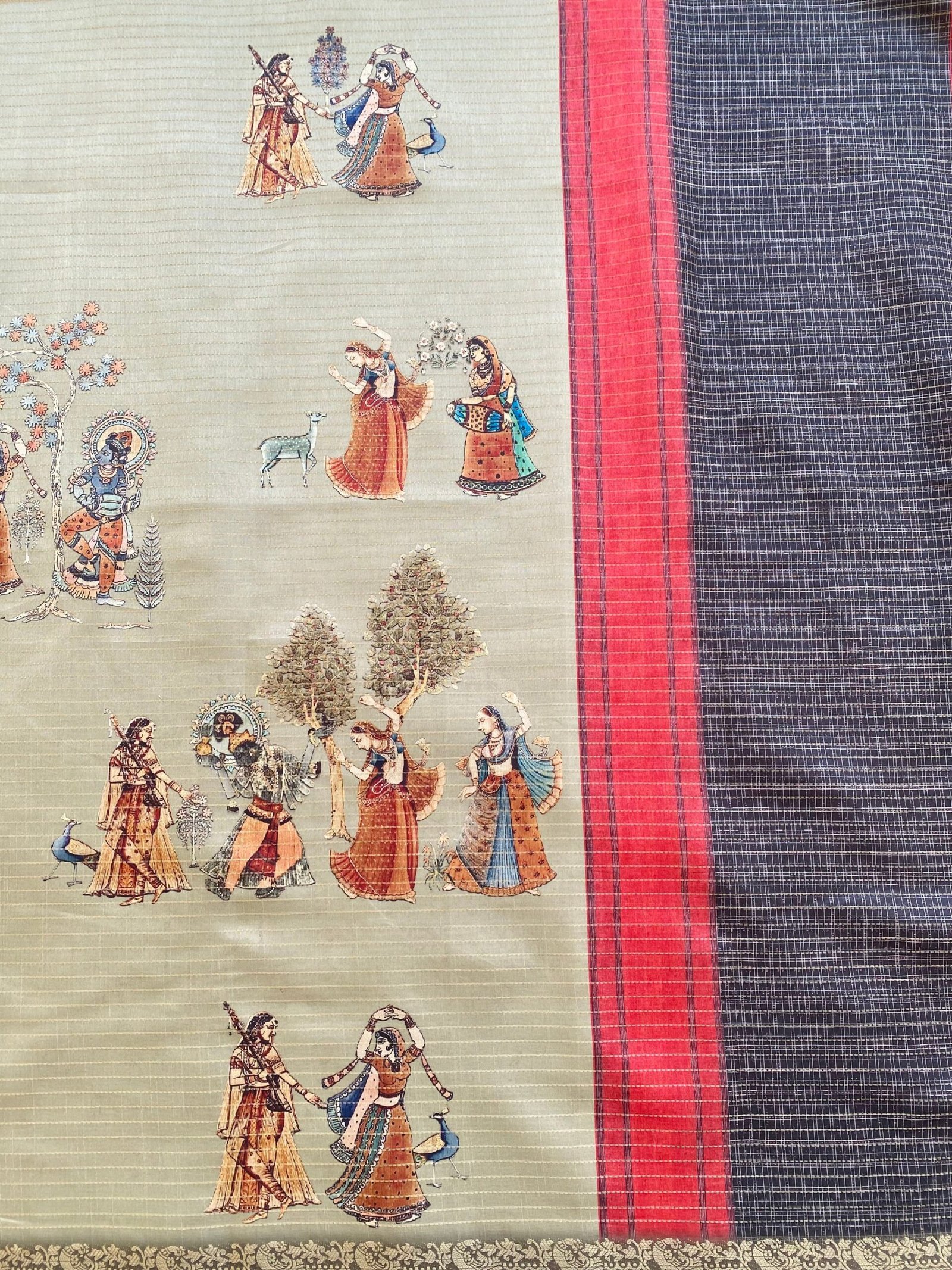 This beautiful Semi-Tussar Silk Saree features a classic checks print with Pichwai designs, showing gopis dancing and having fun. The pallu also has the same checks pattern, giving it a balanced and elegant look. With a gorgeous zari border, this saree adds a touch of tradition and charm. Made from soft and comfortable fabric, it’s easy to drape and gives a perfect fall.