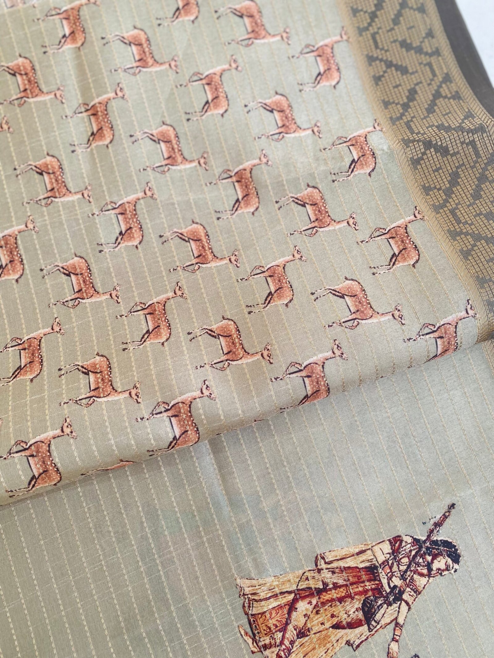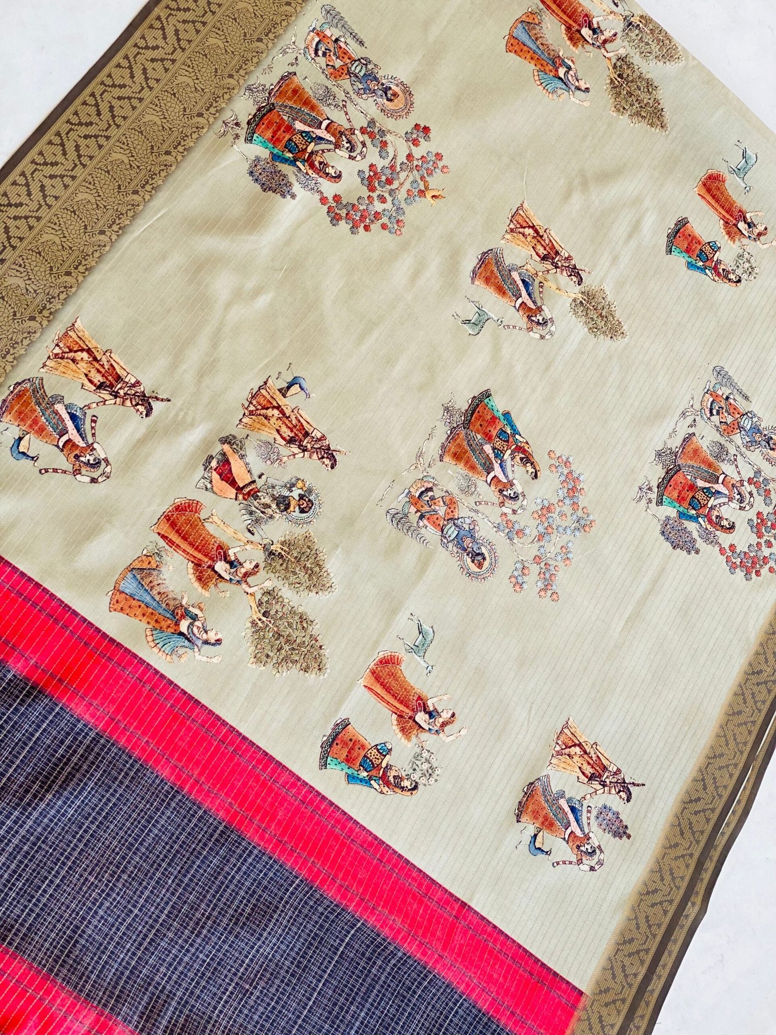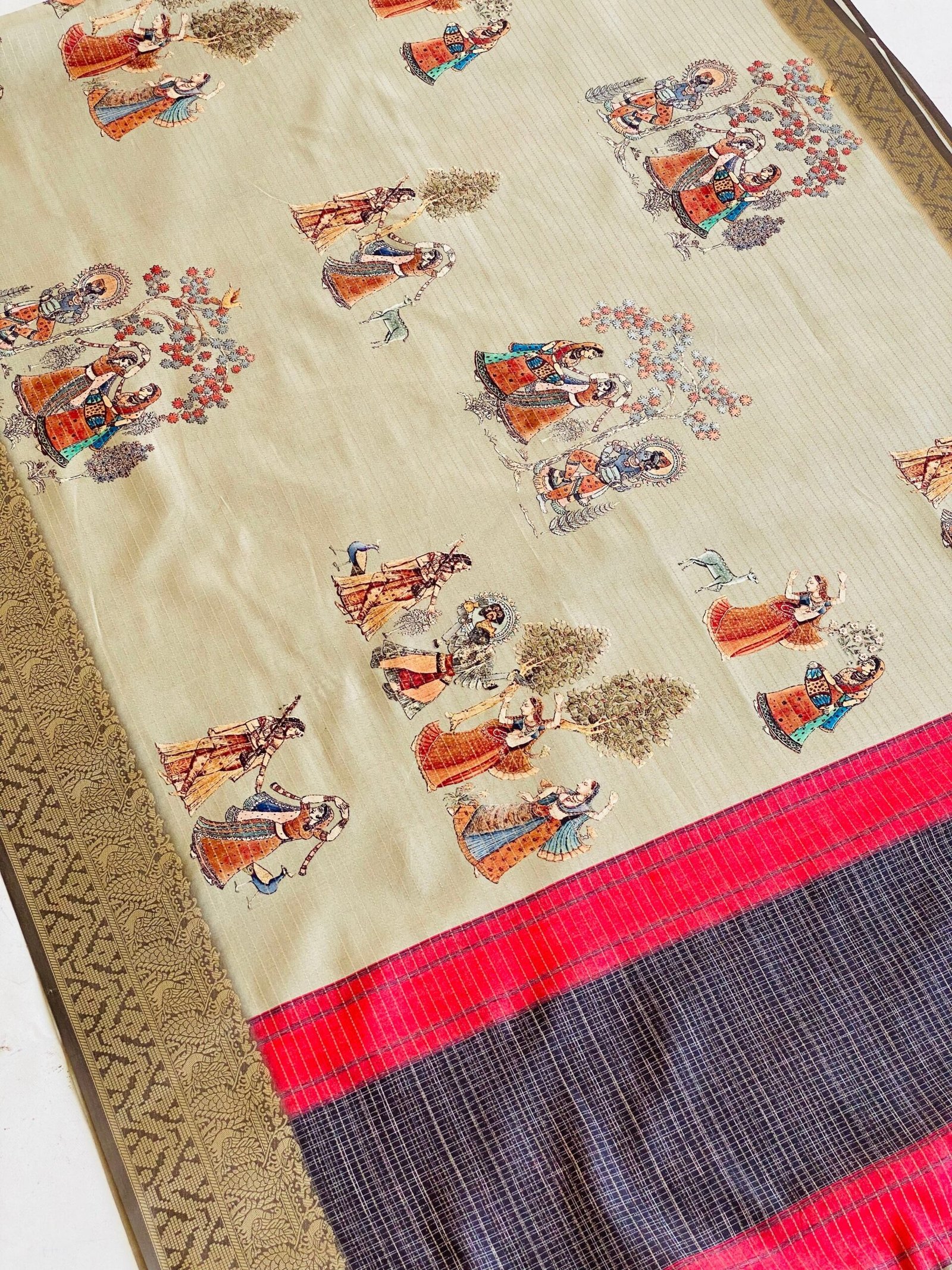 This beautiful Semi-Tussar Silk Saree features a classic checks print with Pichwai designs, showing gopis dancing and having fun. The pallu also has the same checks pattern, giving it a balanced and elegant look. With a gorgeous zari border, this saree adds a touch of tradition and charm. Made from soft and comfortable fabric, it’s easy to drape and gives a perfect fall.