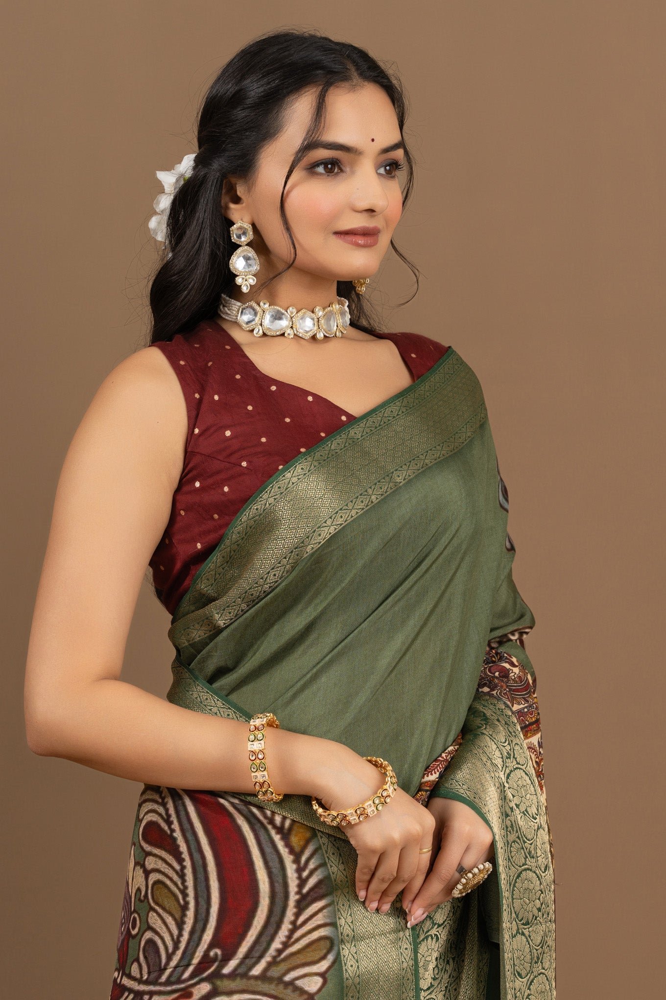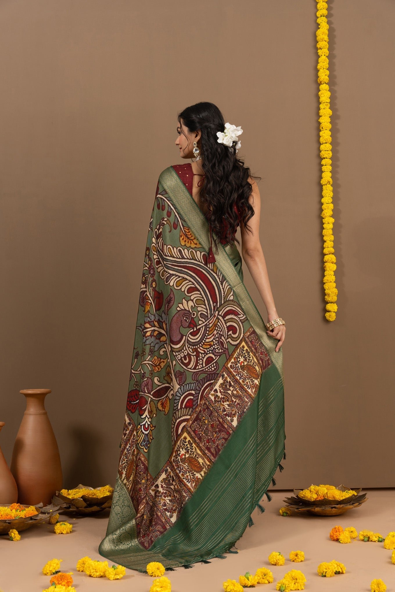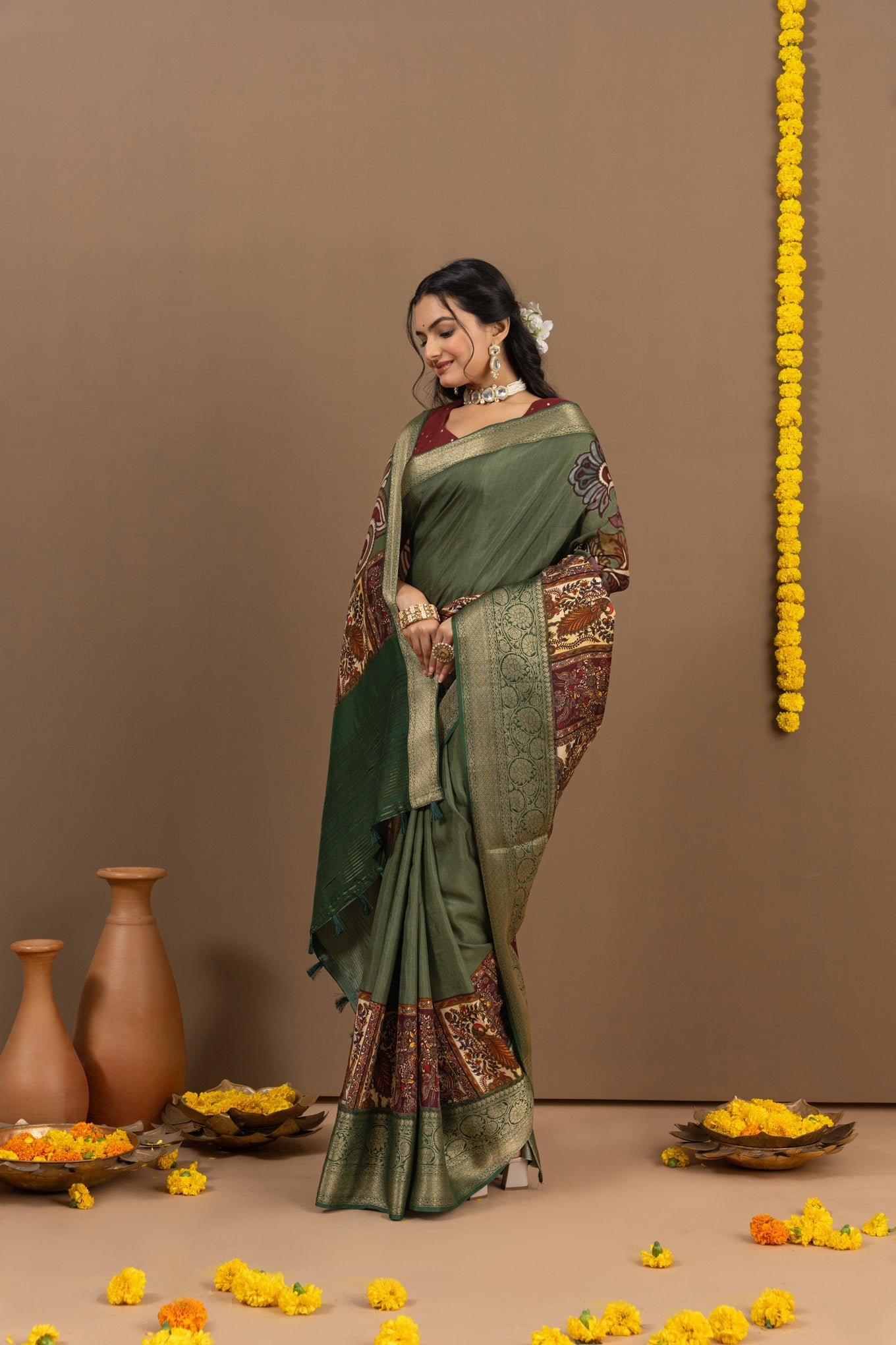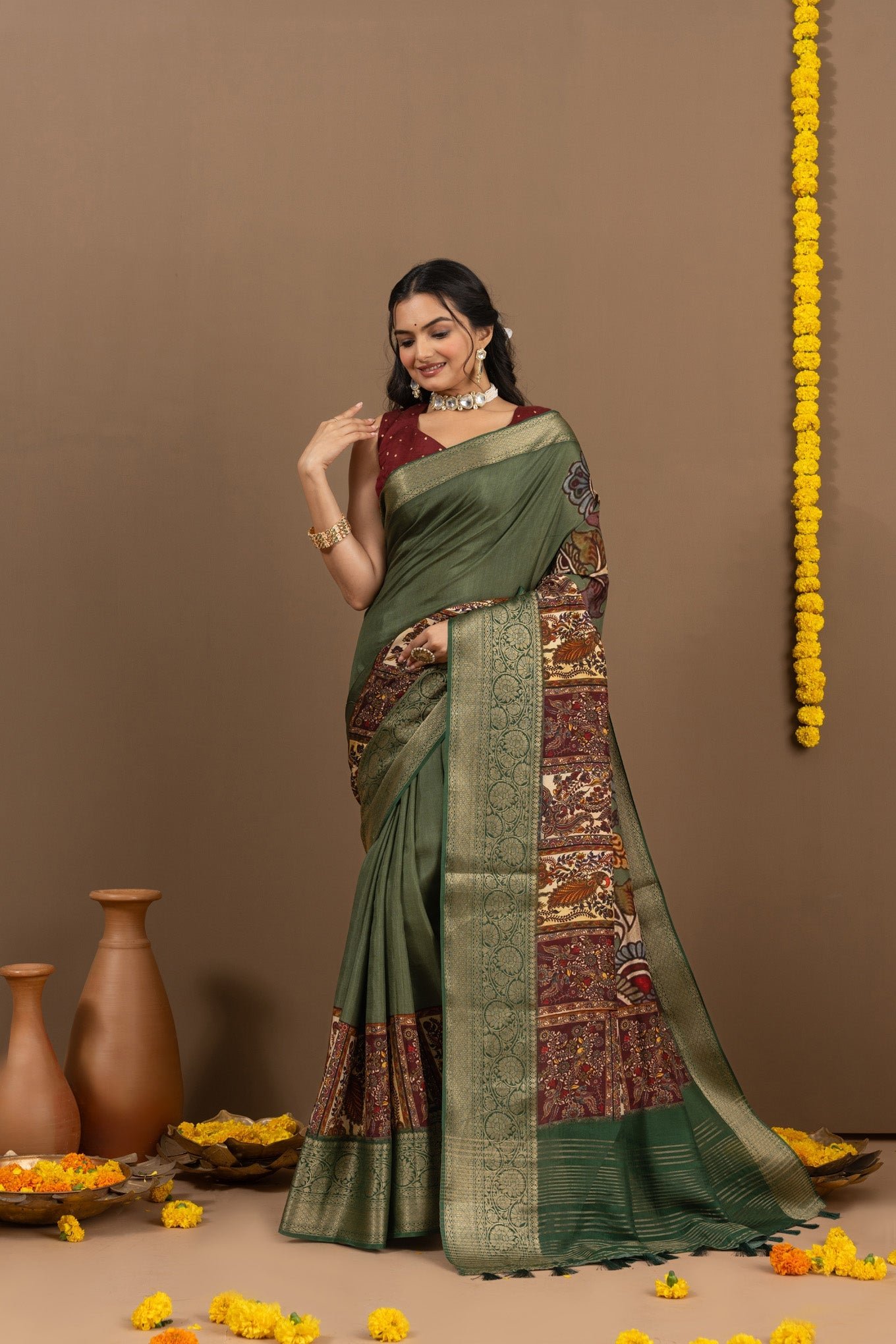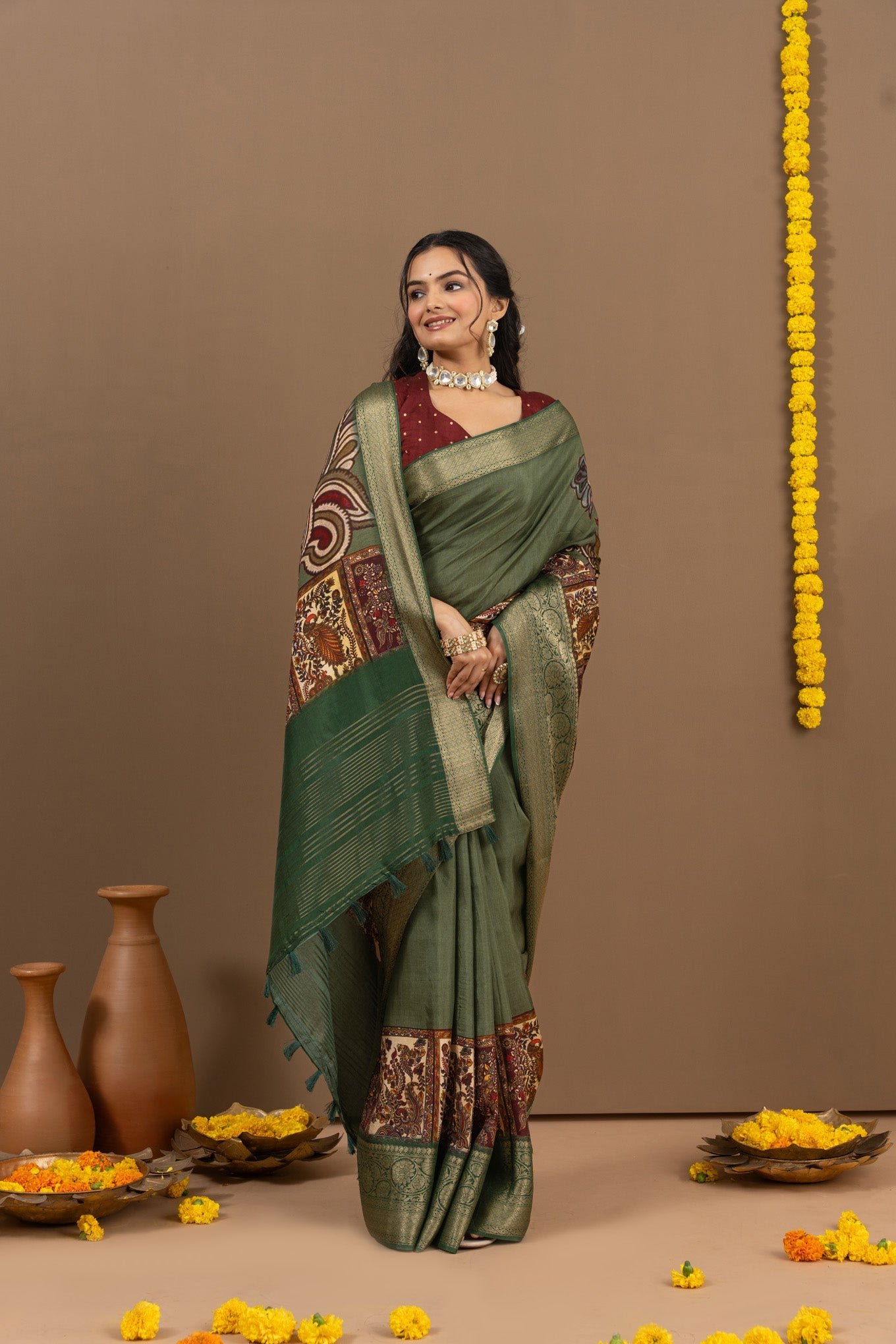 - Fabric is sourced from weavers directly, the border of the saree might vary from piece to piece. This is an external factor and we have no control on things like that.