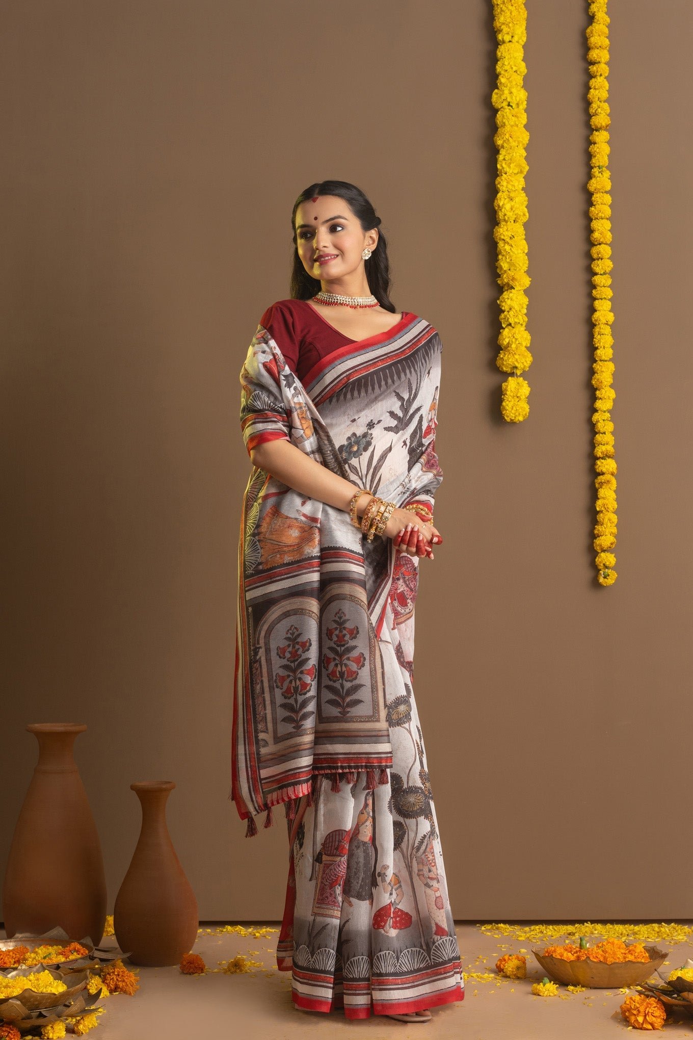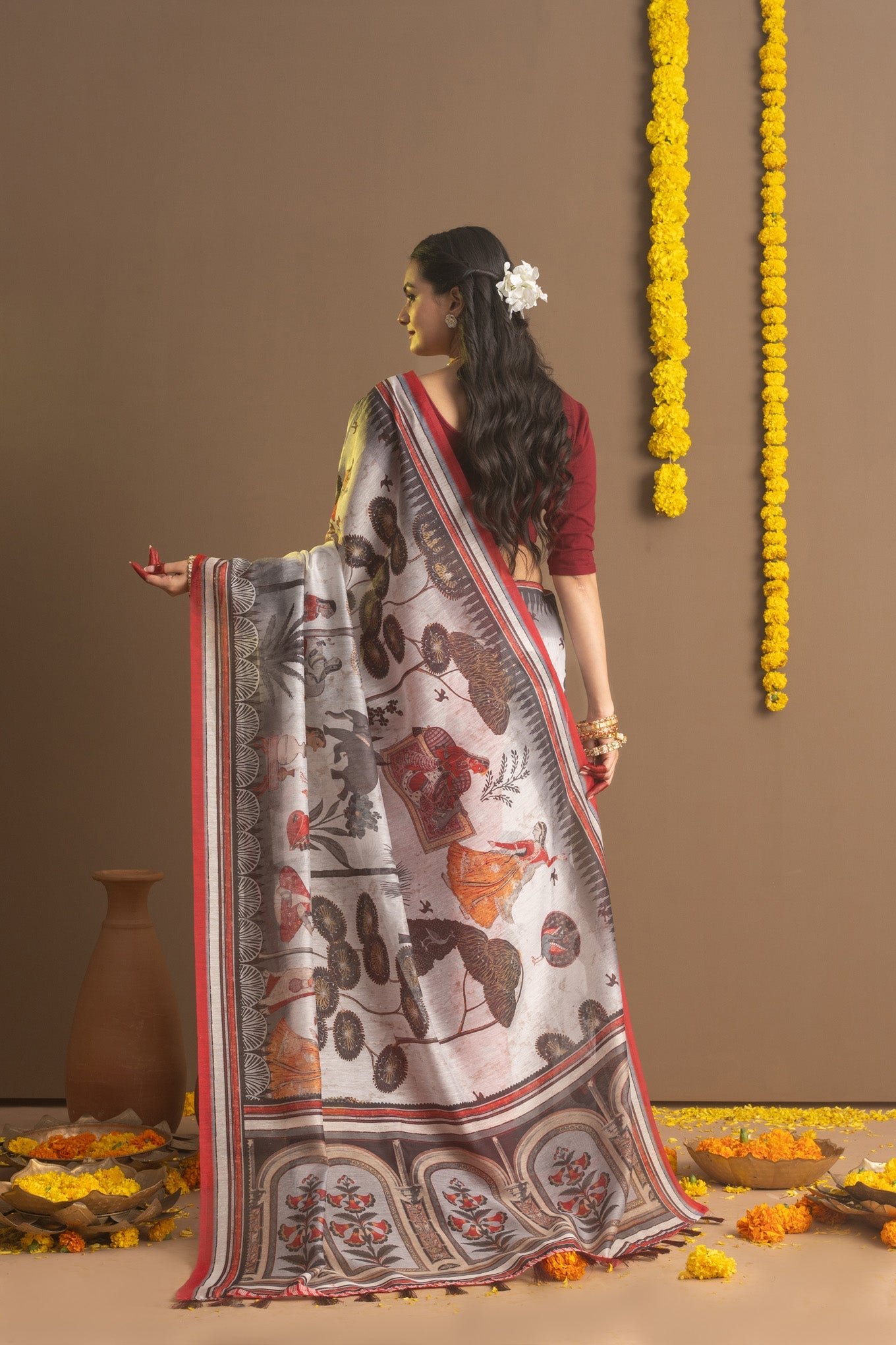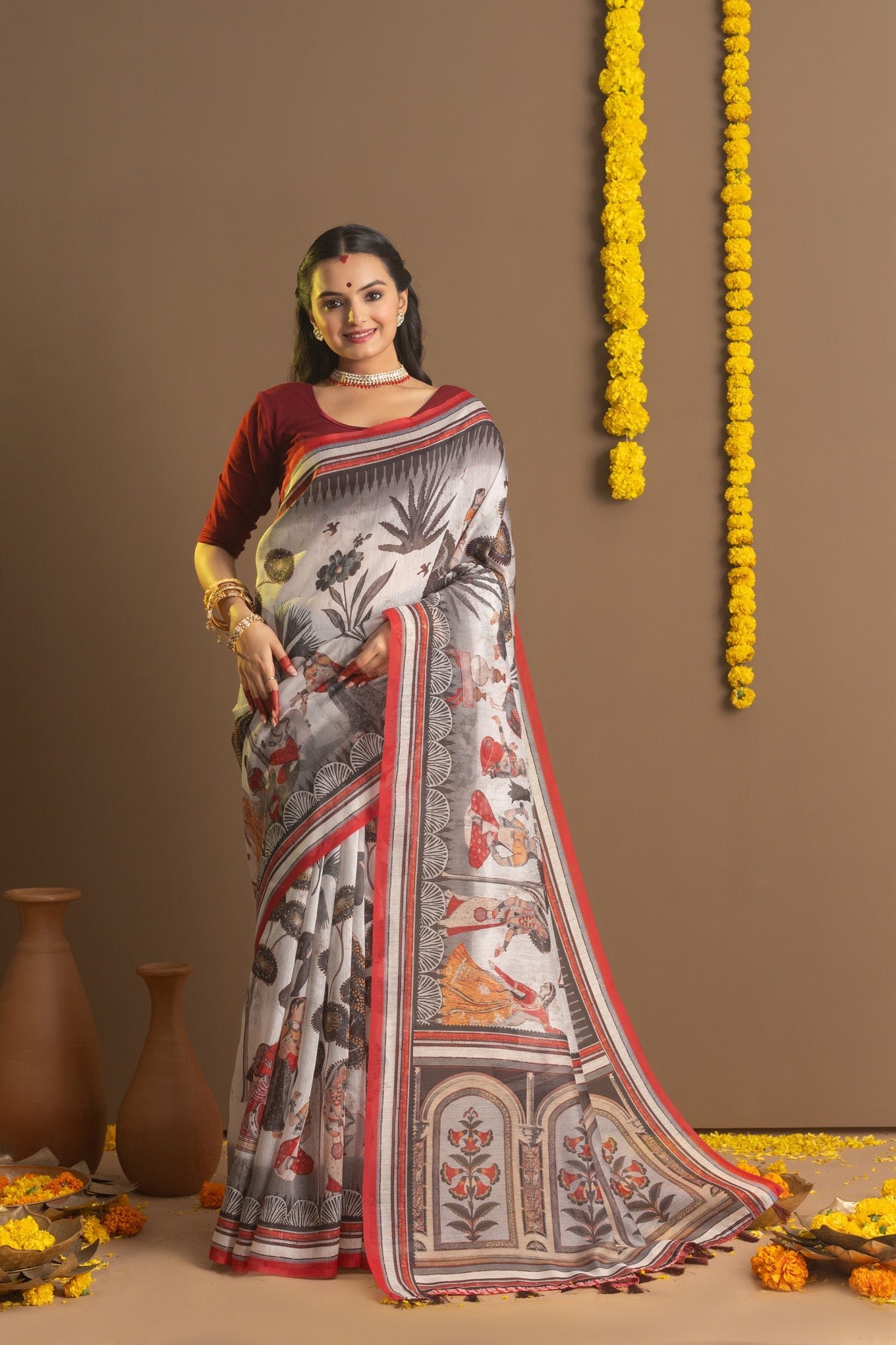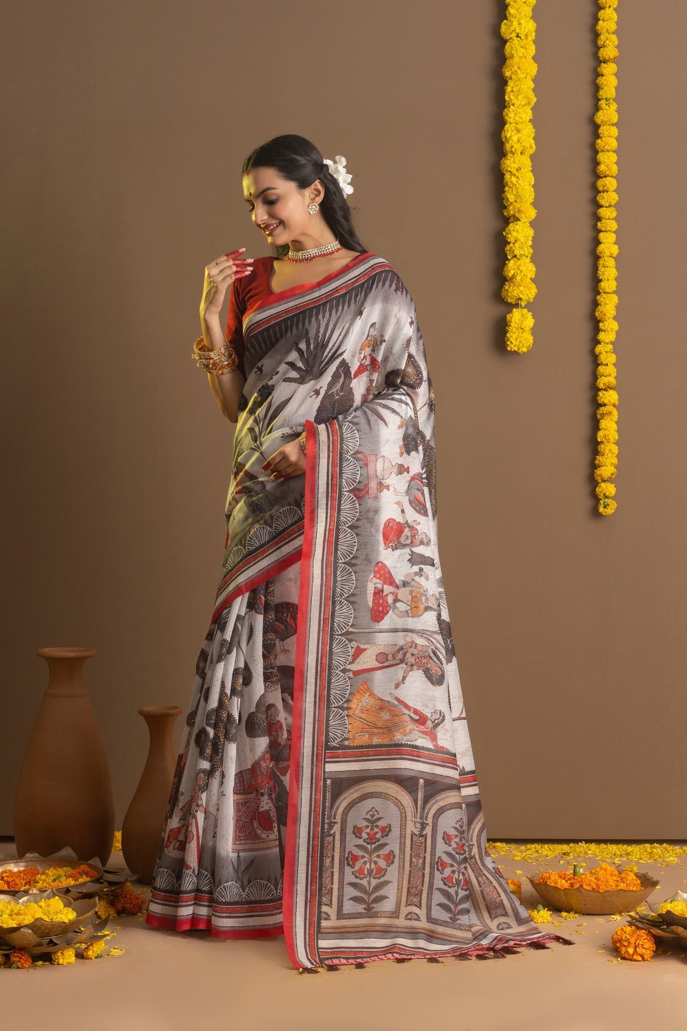Celebrate the spirit of Durga Puja with our beautiful Shubho Pujo Series Sarees, perfect for the festive season. These ethnic sarees feature intricate designs of small birds, figures, and trees woven into the fabric, blending nature and tradition effortlessly. The classic red and white colors, popular during Durga Puja, add a vibrant festive vibe. Some sarees also showcase lovely flower prints on the pallu, combining elegance with a traditional touch. Embrace the charm of luxury sarees and Indian ethnic wear with the exclusive creations from Ekana Label. Each saree comes with an unstitched blouse, making it a perfect addition to your wardrobe this season.