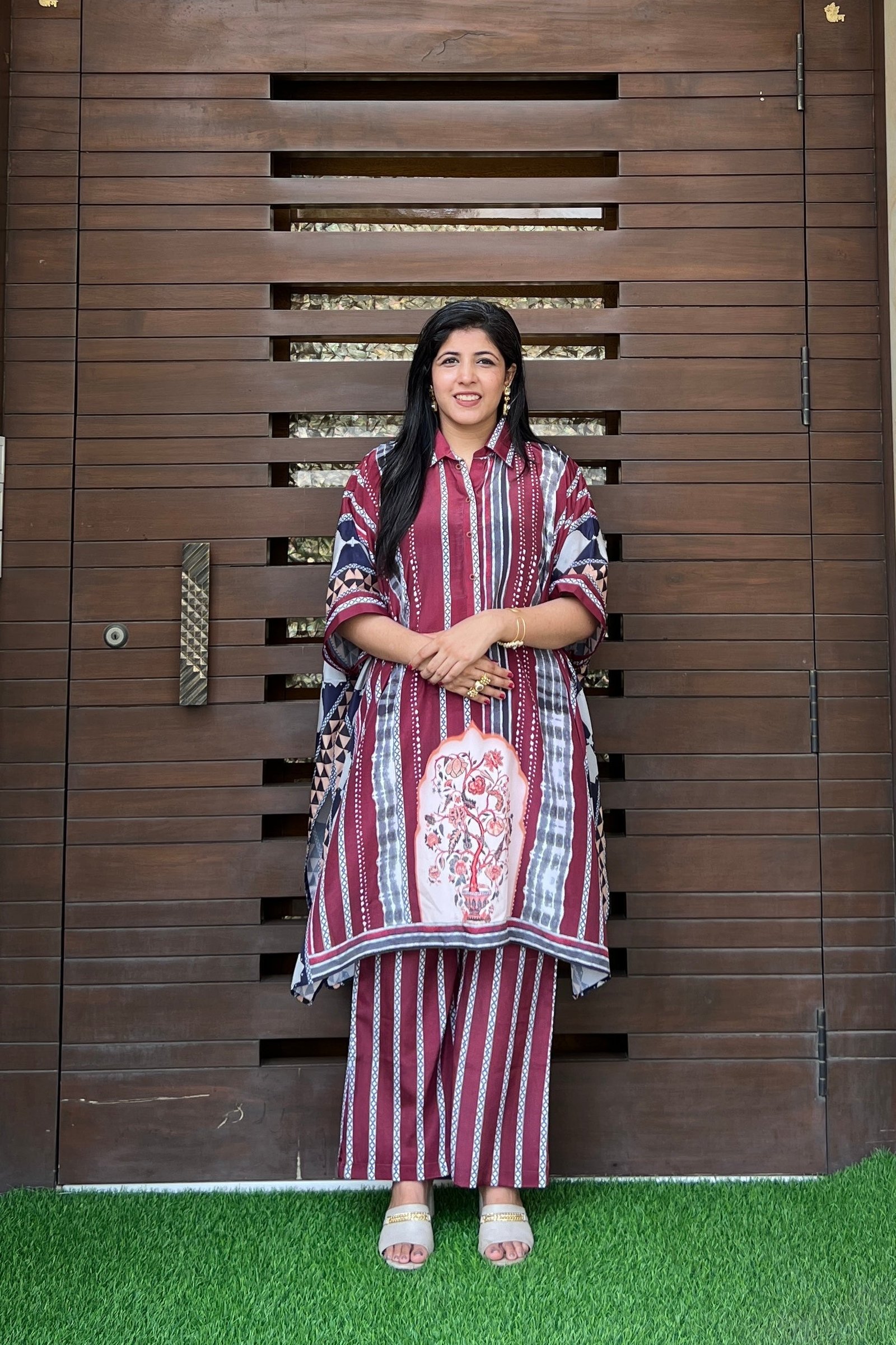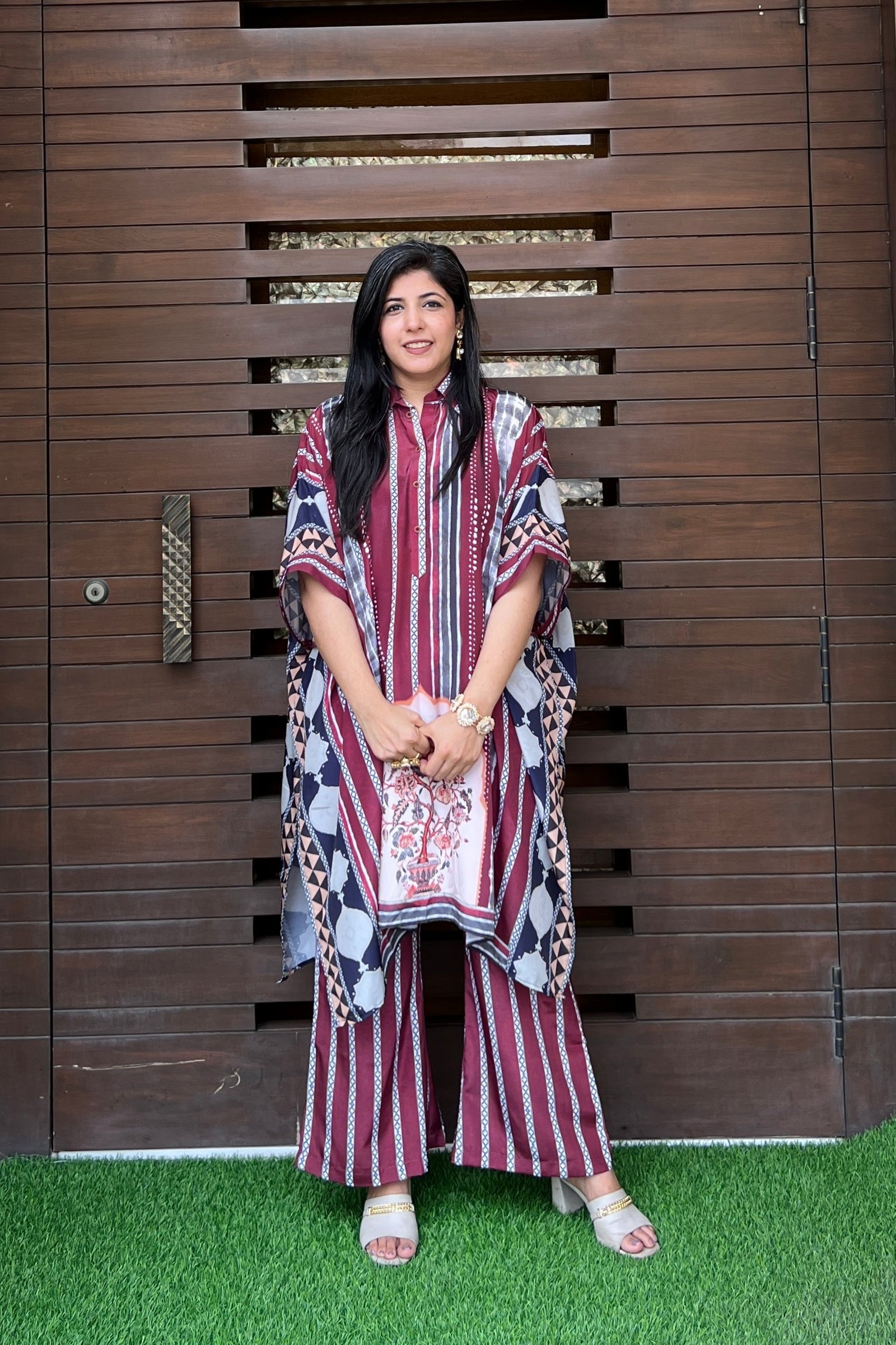 The flowing silhouette of the kaftan offers unmatched comfort while maintaining a chic and stylish look. Perfect for any occasion, this maroon kaftan set is a versatile addition to your wardrobe.