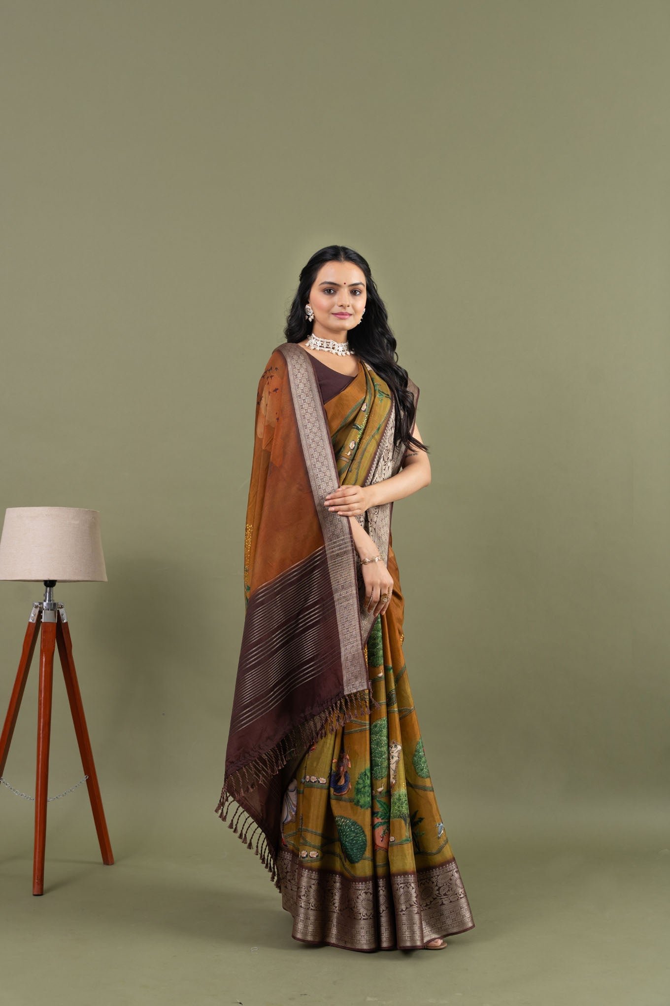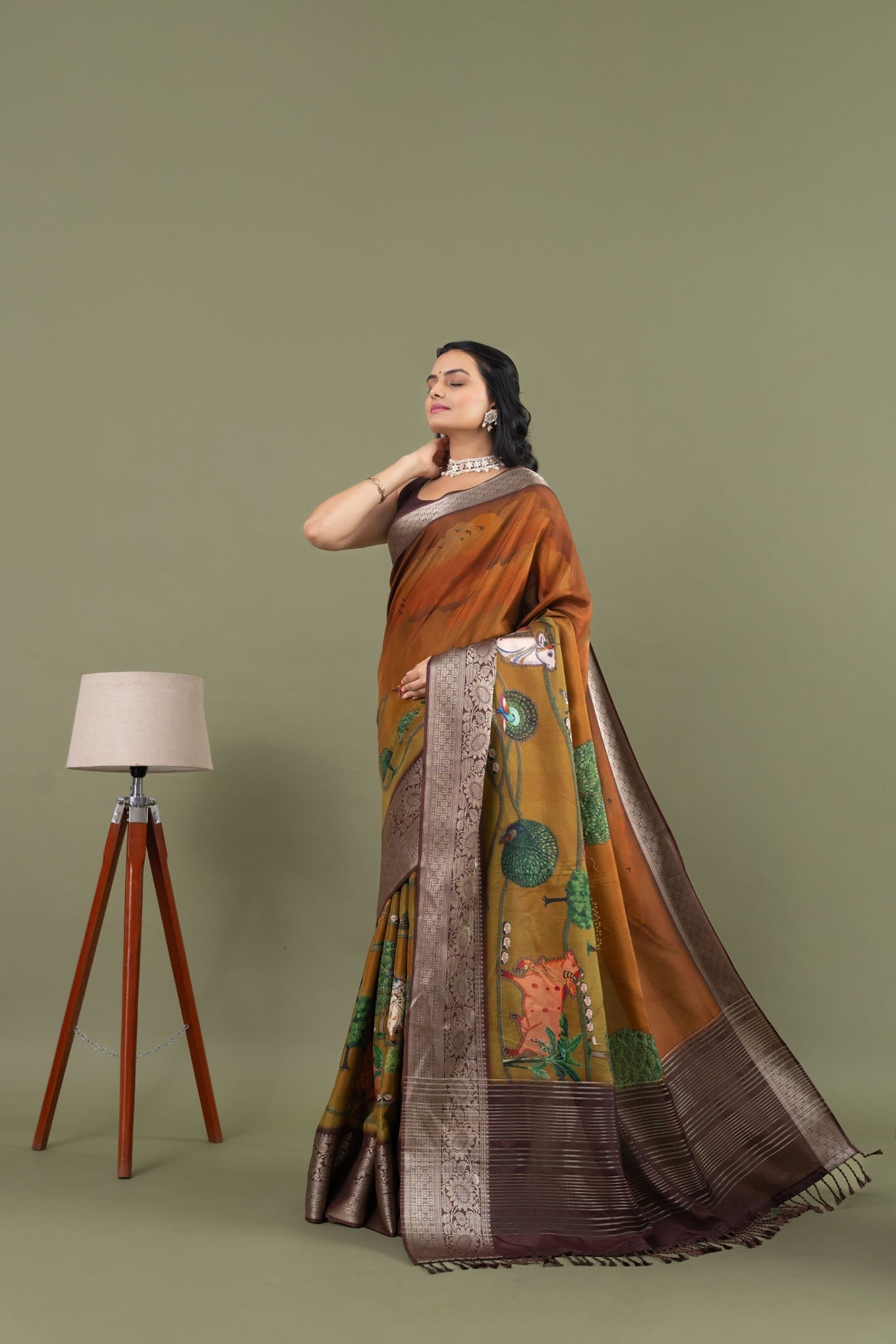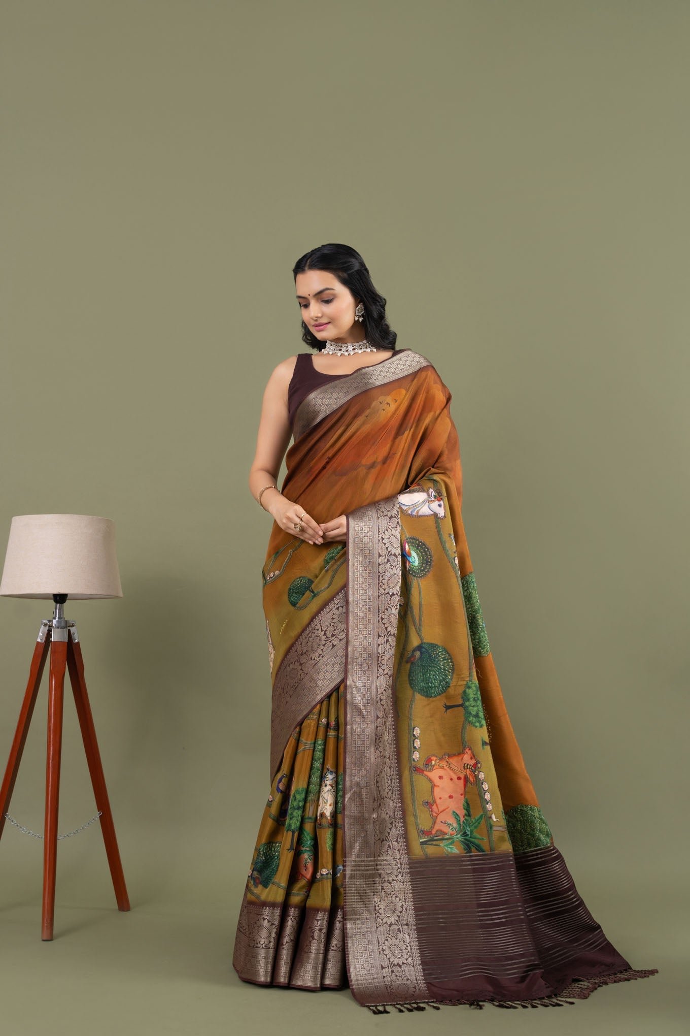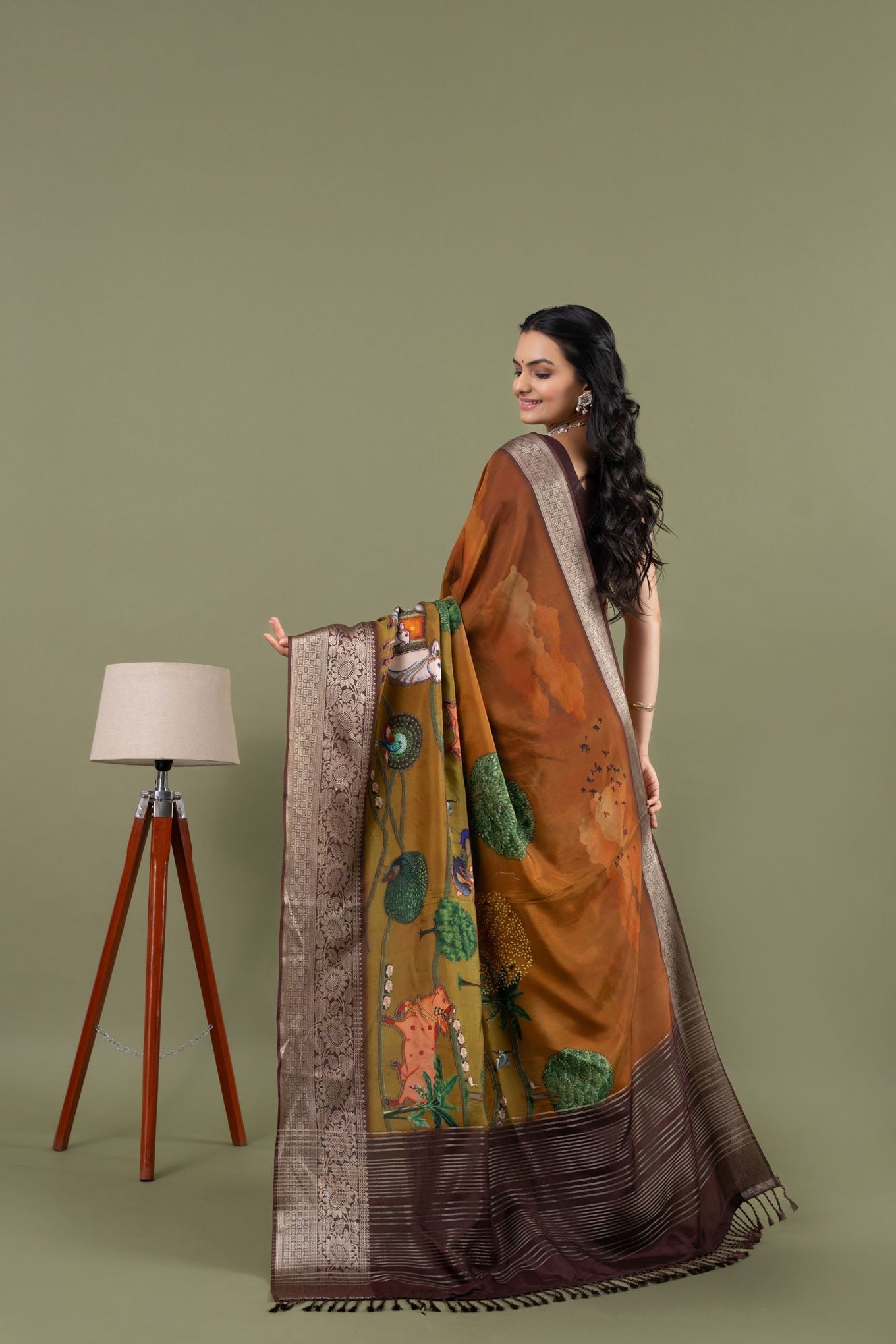 The Rani Mahal Sarees, are inspired by the breathtaking sunset views from the Rani Mahal. This exquisite pure Dola silk saree captures the enchanting colours of the evening sky, creating a picturesque base for the saree. The intricate weaving pallu and soft cotton jacquard butti blouse enhance its elegance, while the designs depict a serene scene with trees, cows, and birds, all viewed from the Rani Mahal as the queen admires the beauty of the sunset. Experience the beauty and grace of the Rani Mahal Sarees on our website and let the magic of the sunset elevate your style.