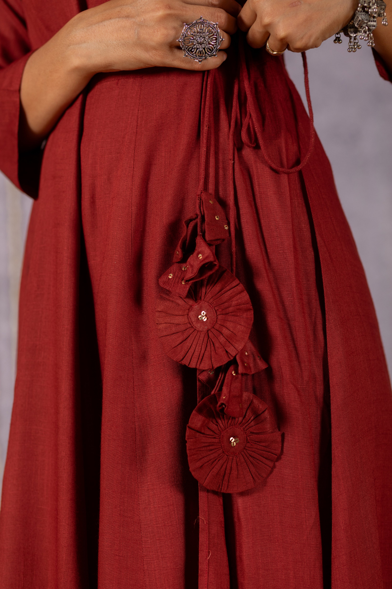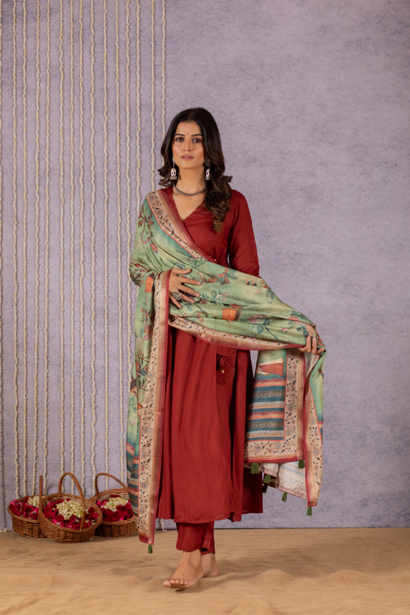 This gorgeous Angrakha pure bhagalpuri suit set is made with handcrafted fabric. Elevate your style with our exquisite dress featuring delicate latkans adorning the left side of the kurta, adding a touch of charm and sophistication to your ensemble. Top and bottom are dyed with beautiful solid colours and comes with semi-tussar silk dupatta along with tassels on each end of the dupatta.