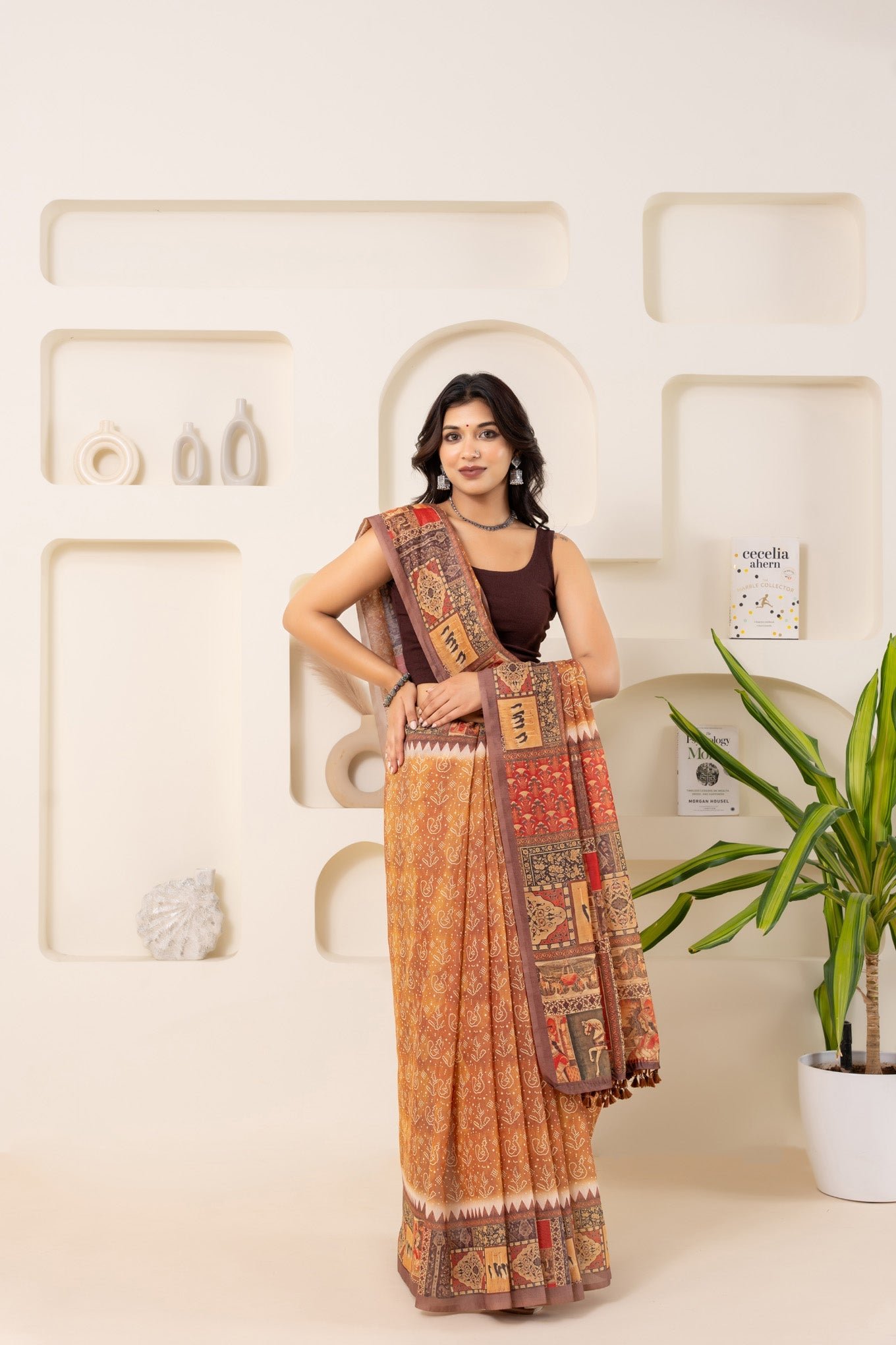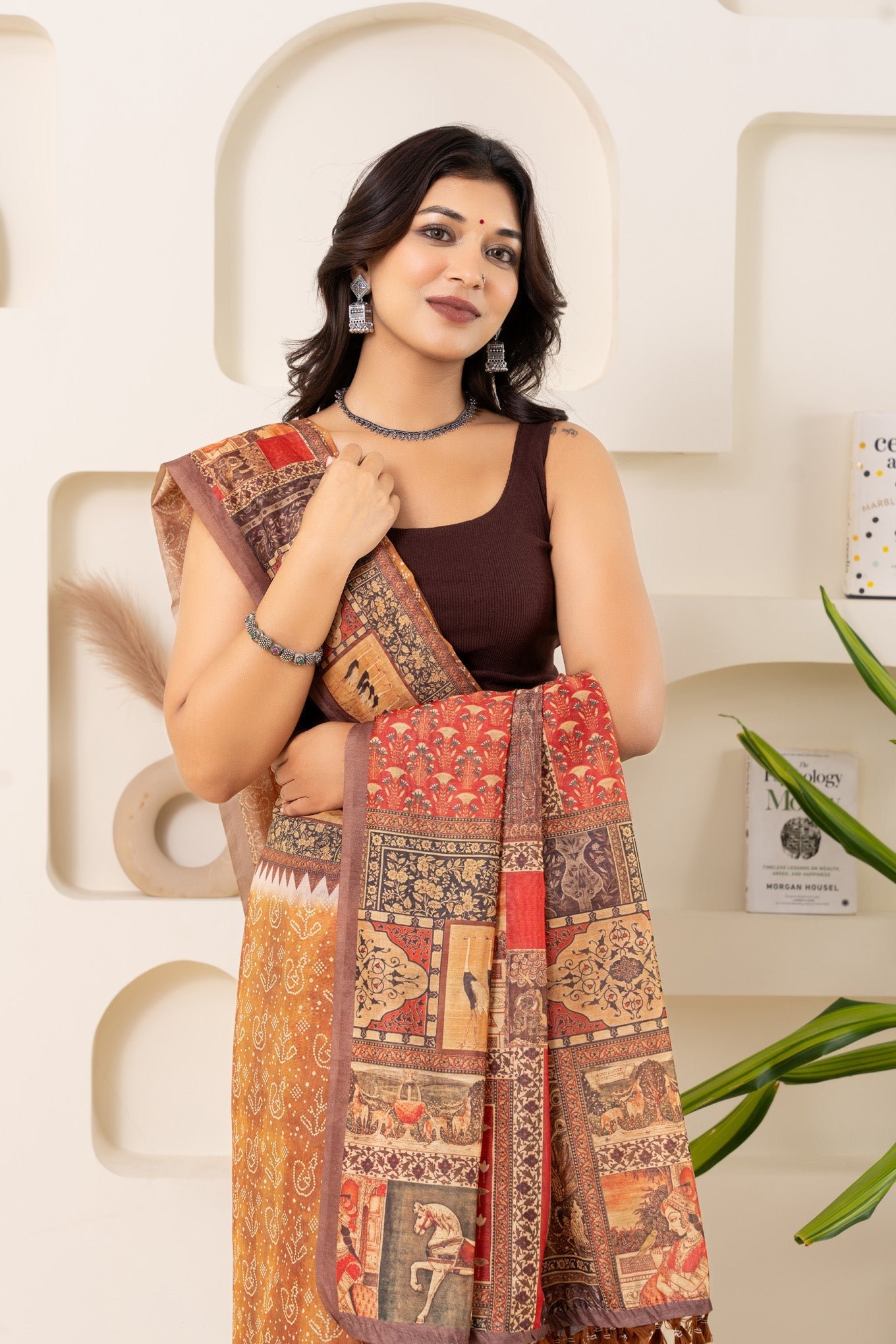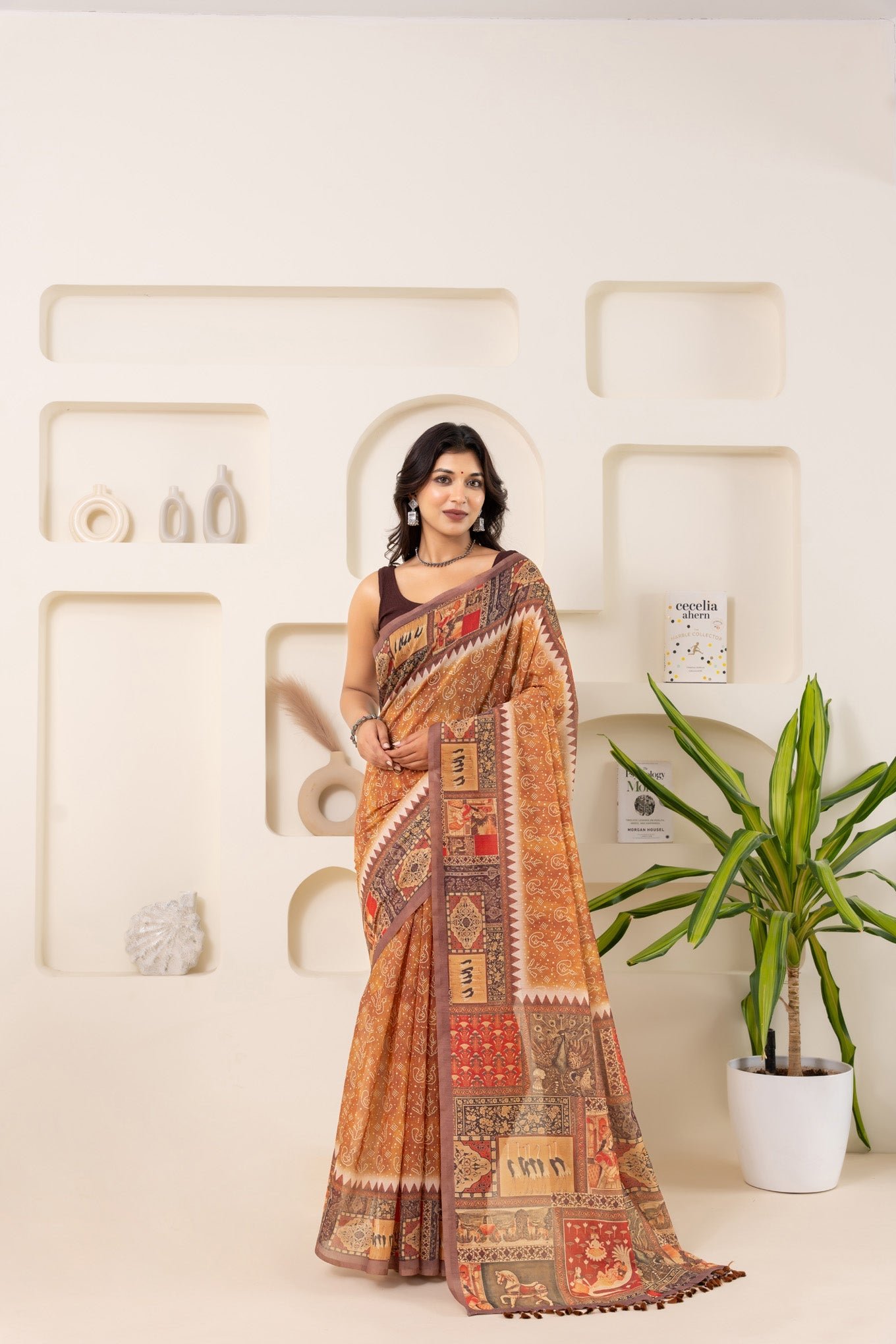 Discover the elegance of our latest Chanderi cotton sarees, now featuring exquisite Bandhani prints in a vibrant yellow colour. Each saree is adorned with a stunning Ikat print border and a pallu crafted in intricate block prints. The harmonious blend of traditional techniques and contemporary design makes these sarees a perfect choice for any occasion. With their beautiful overall prints and soft, breathable fabric, our Chanderi cotton sarees offer both comfort and style. The saree comes with contrast and an unstitched blouse.