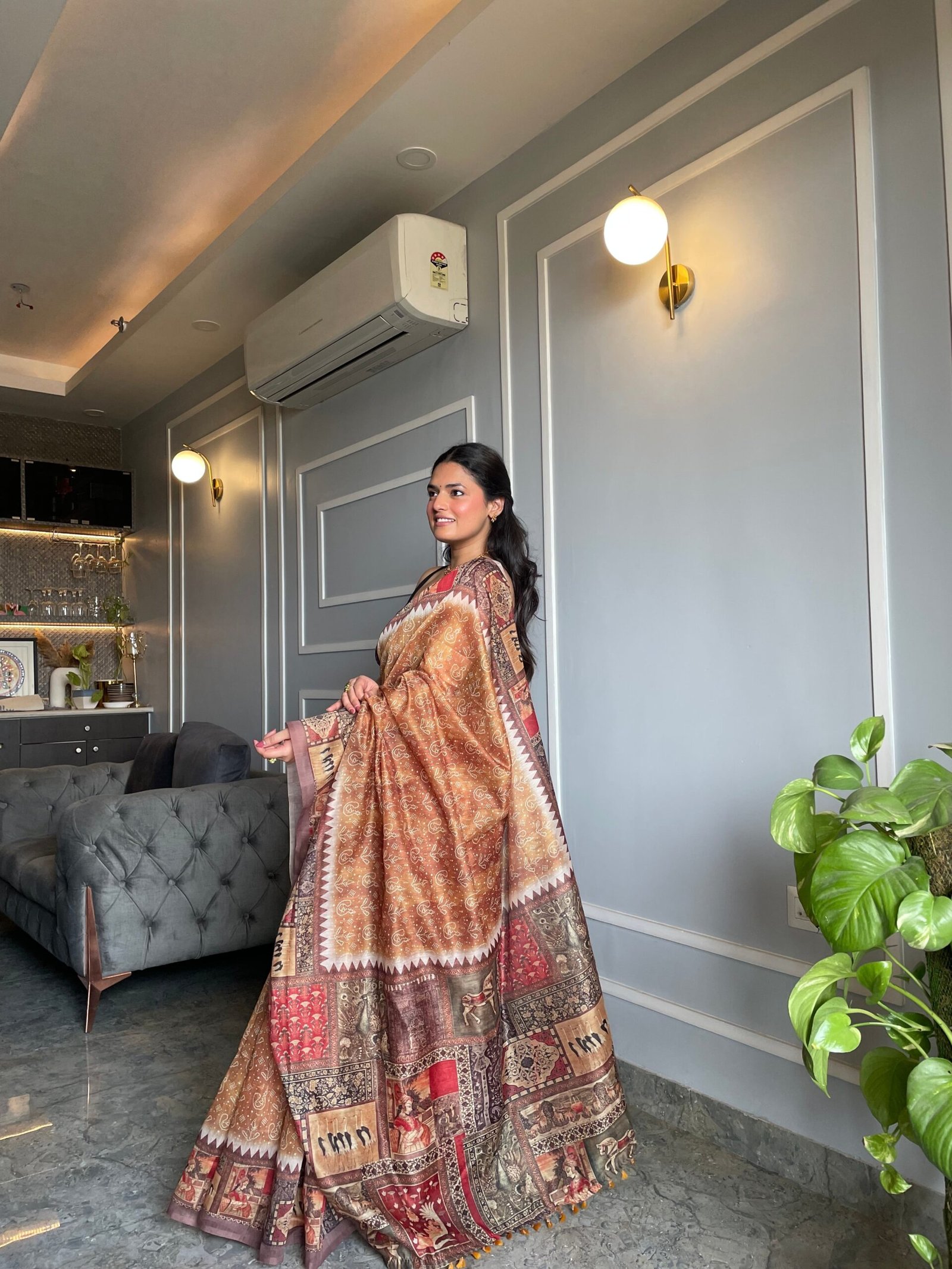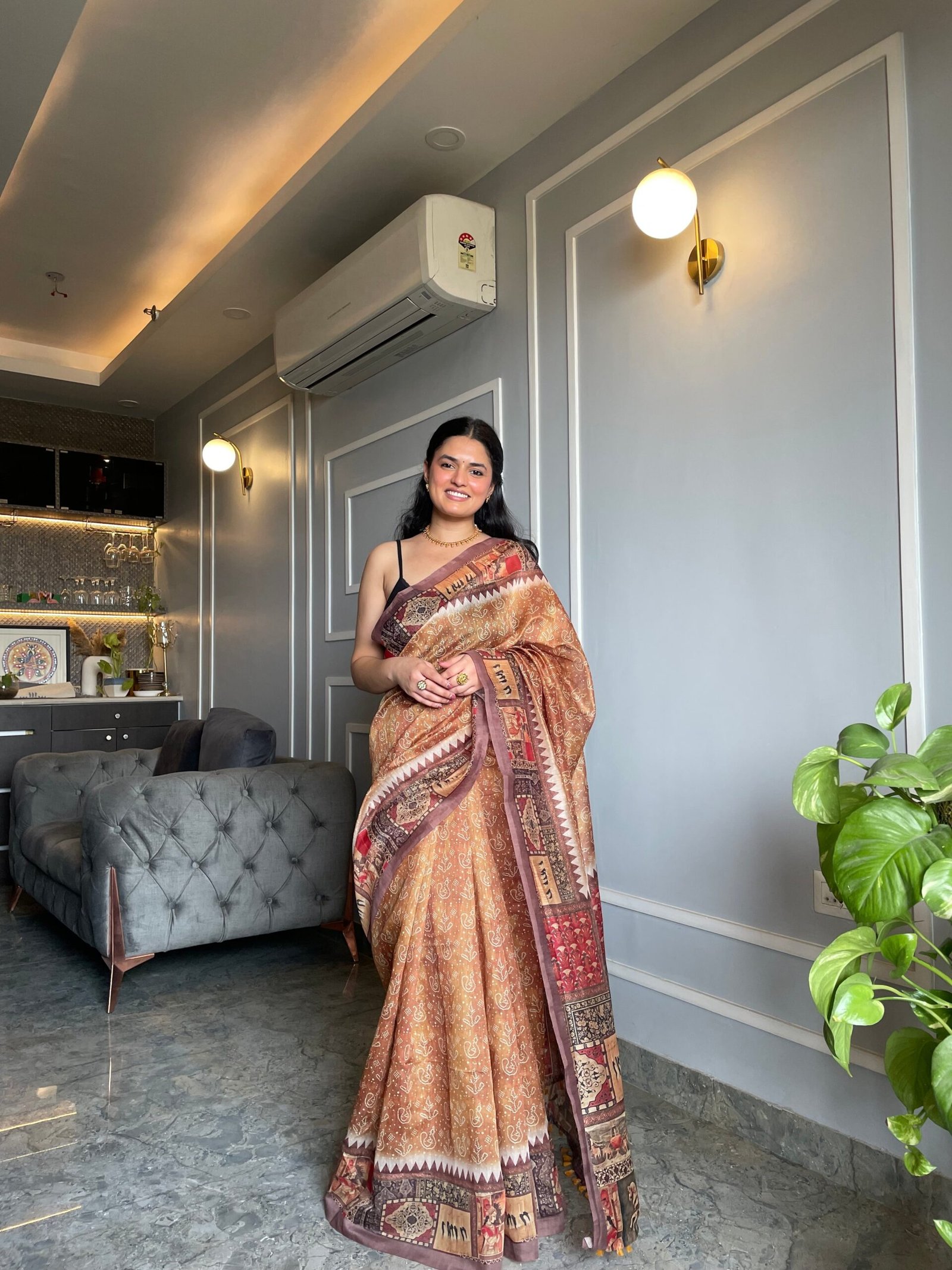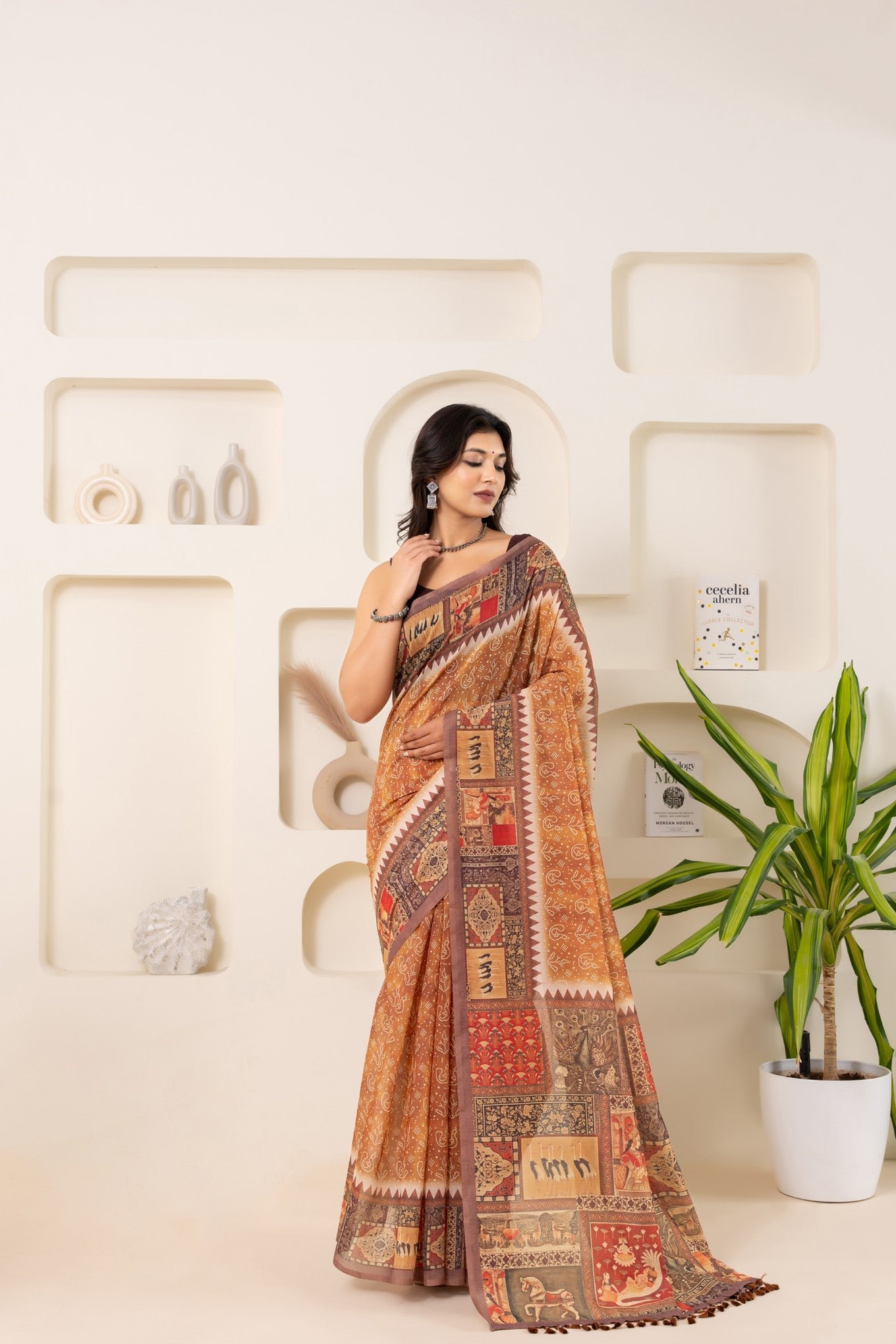 Discover the elegance of our latest Chanderi cotton sarees, now featuring exquisite Bandhani prints in a vibrant yellow colour. Each saree is adorned with a stunning Ikat print border and a pallu crafted in intricate block prints. The harmonious blend of traditional techniques and contemporary design makes these sarees a perfect choice for any occasion. With their beautiful overall prints and soft, breathable fabric, our Chanderi cotton sarees offer both comfort and style. The saree comes with contrast and an unstitched blouse.