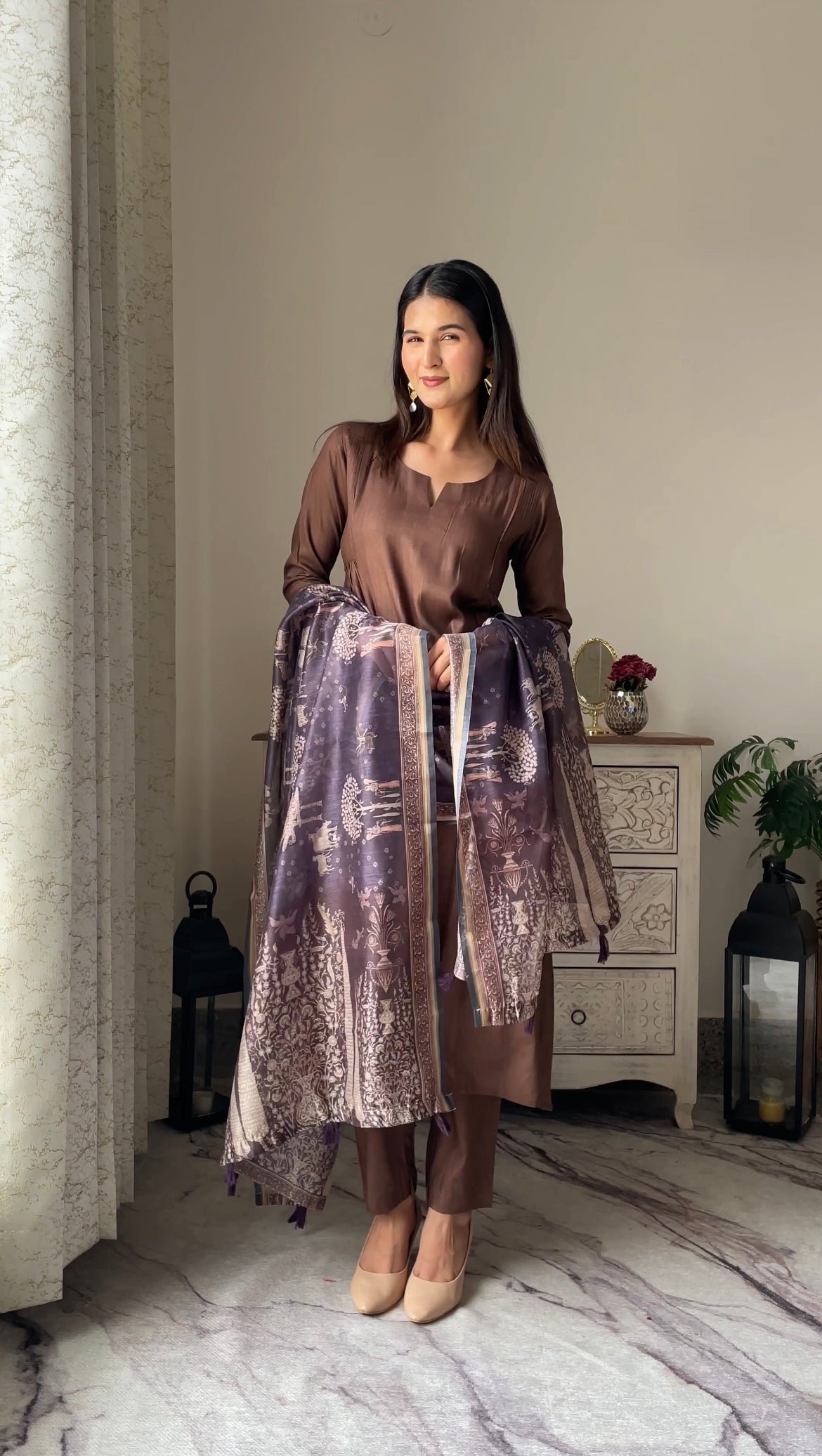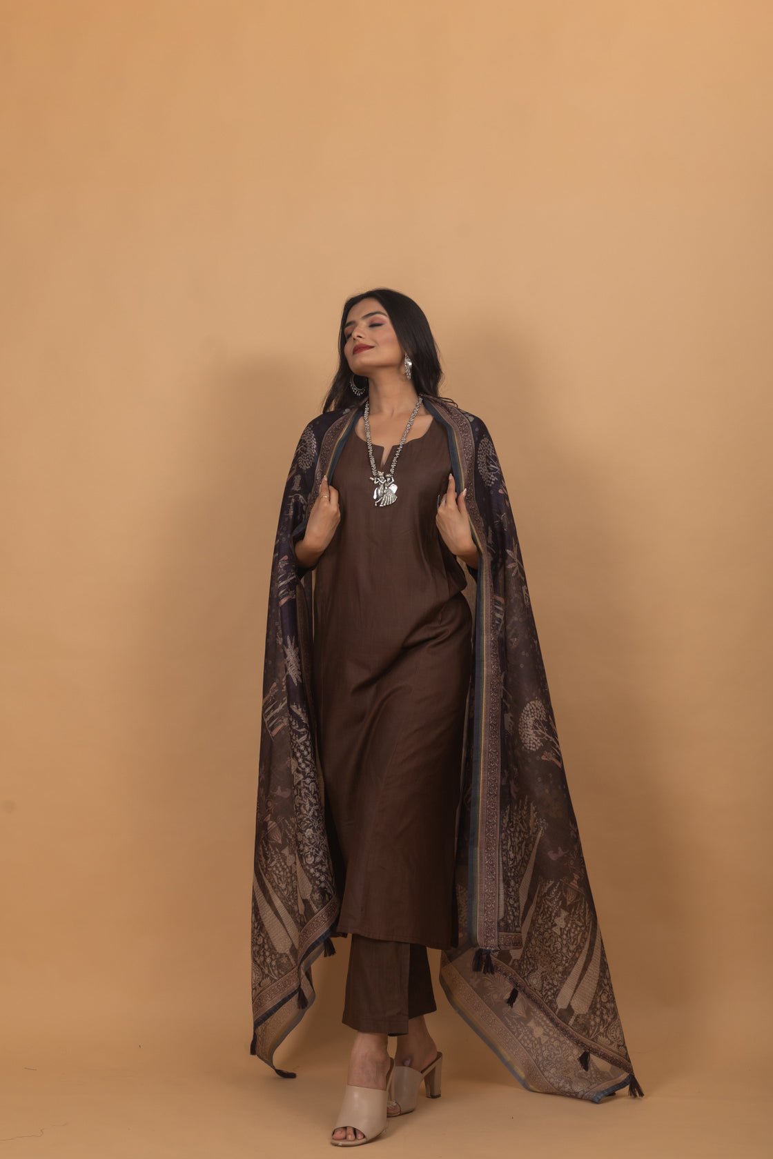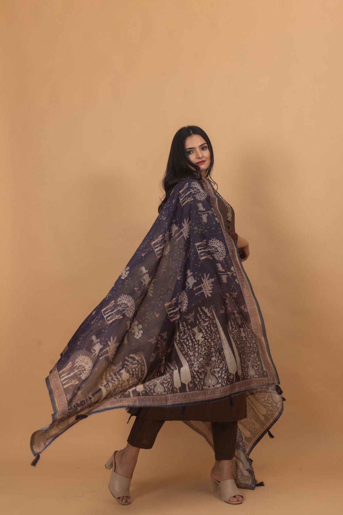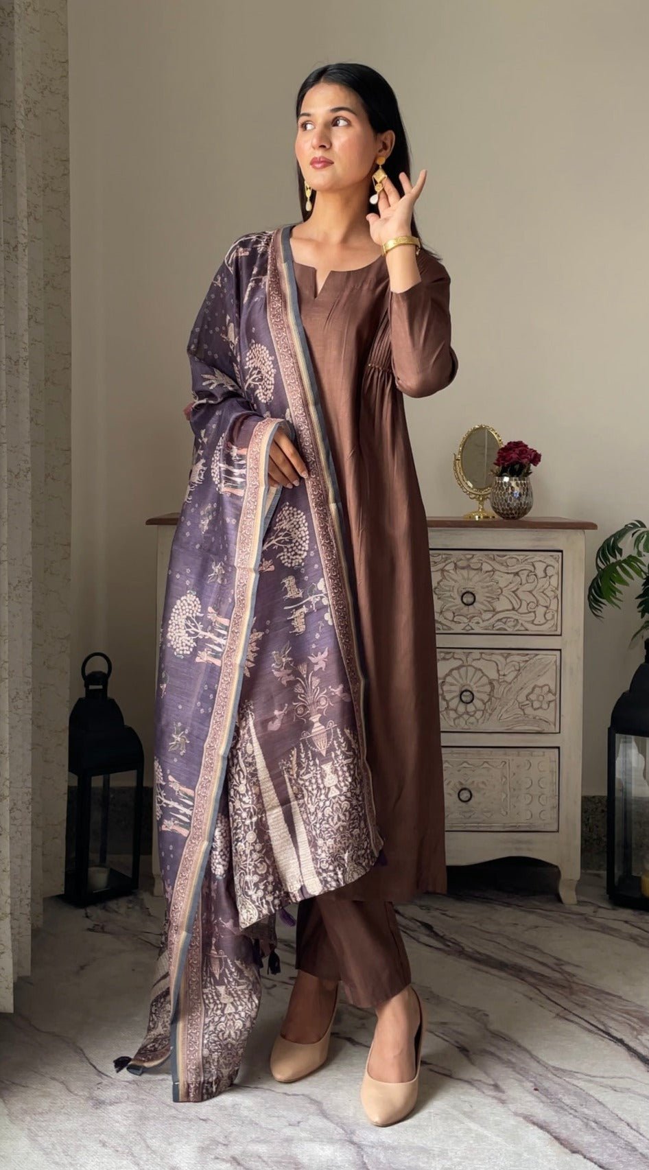This gorgeous pure bhagalpuri suit set is made with handcrafted fabric. The top and bottom are dyed with beautiful solid colours and come with a Pichwai handloom cotton silk dupatta along with tassels on each end of the dupatta.